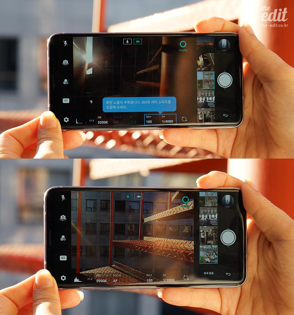 LG는 스마트폰 카메라의 전문가 모드를 가장 공들여 만드는 제조사다. 이번엔 그래피 모드라는 기능을 넣었다. 일종의 치트키다. 전문가 모드의 설정값을 조작하기가 번거롭거나 어렵다면, 전문가가 미리 설정해둔 값을 훔쳐(?)쓸 수 있는 기능이다. 야경이나 풍경, 실내 사진 등 다양한 샘플 사진이 준비돼 있다. 불꽃놀이 사진도 있던데 얼마 전 있었던 여의도 불꽃놀이에 V30를 들고 가셨다면 유용했겠다. 물론 이 설정값이 절대적일 순 없다. 촬영 환경이 조금씩 다를 테니까. 원하는 샘플 샷을 고르면, 실제 촬영 환경에 따라 ISO나 셔터 스피드를 조절하라는 가이드가 나타난다. 전문가 모드를 제대로 쓰지 않는 사용자가 대부분인 것으로 알고 있다. 절충안을 마련한 것 같은 기능이라 흡족하다. 샘플샷은 추가로 다운로드할 수 있다.