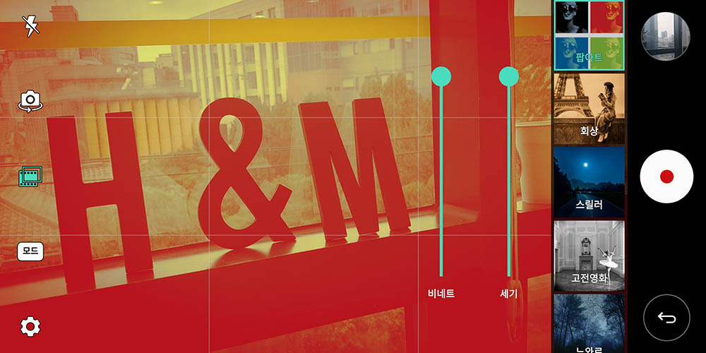 효과는 총 15가지다. 로맨틱 코미디, 멜로, 미스터리, 느와르, 고전 영화 등이다. 이름처럼 장르별 영화 촬영에 사용하는 색감과 느낌을 표현해둔 필터다. 대체로 좀 과하다 싶은데, 각각 강도를 조절할 수 있다. 대부분 70% 강도 정도로 촬영하는 게 예쁘더라. 필터 효과와 함께 가장자리를 어둡게 만드는 비네트 효과도 원하는 강도대로 적용할 수 있다.