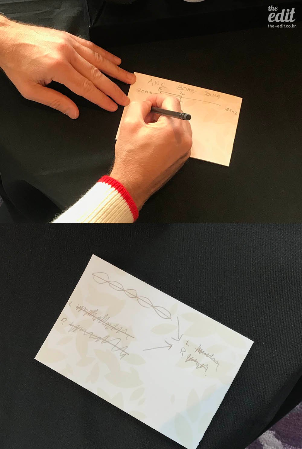 루크 우드가 직접 그림까지 그려가며 Pure ANC 기술을 설명해줬는데, 내가 좀 더 쉽게 정리해보자면 이렇다. 이 헤드셋은 내가 장소를 이동하거나, 주변 소음이 달라질 때마다 그걸 파악해서 최적의 노이즈캔슬링을 제공한다. 아주 솜씨 좋은 웨이트리스 같은 존재다. 손님이 수저를 떨어트리면 즉시 새 수저를 가져오고, 햇볕이 너무 세다 싶으면 블라인드를 내려주고, 물잔이 비기 전에 시원한 물을 가득 따라준다. 어떻게 이런 서비스가 가능할까? 계속해서 손님의 행동과 표정에 촉각을 곤두세우고 있기 때문이다.