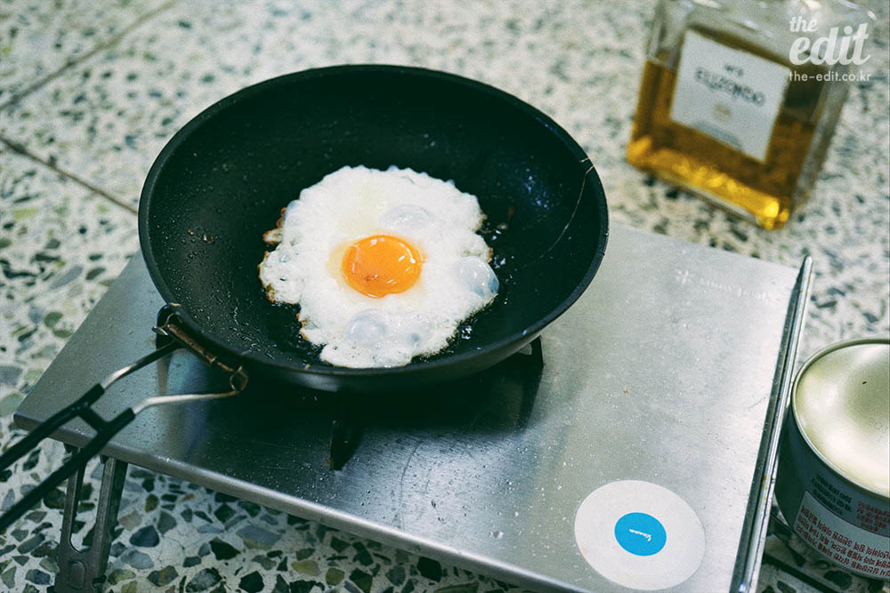 때마침 캠핑에 다녀온 직후라, 사무실에 캠핑용 버너가 있었다. 사무실 한구석에 쭈그리고 앉아 기름냄새 풍기며 계란후라이를 지지기 시작했다. 계란은 무조건 반숙이다. 노른자가 당장이라도 터져 흘러나올 것 같은 아슬아슬함을 간직해야 한다.