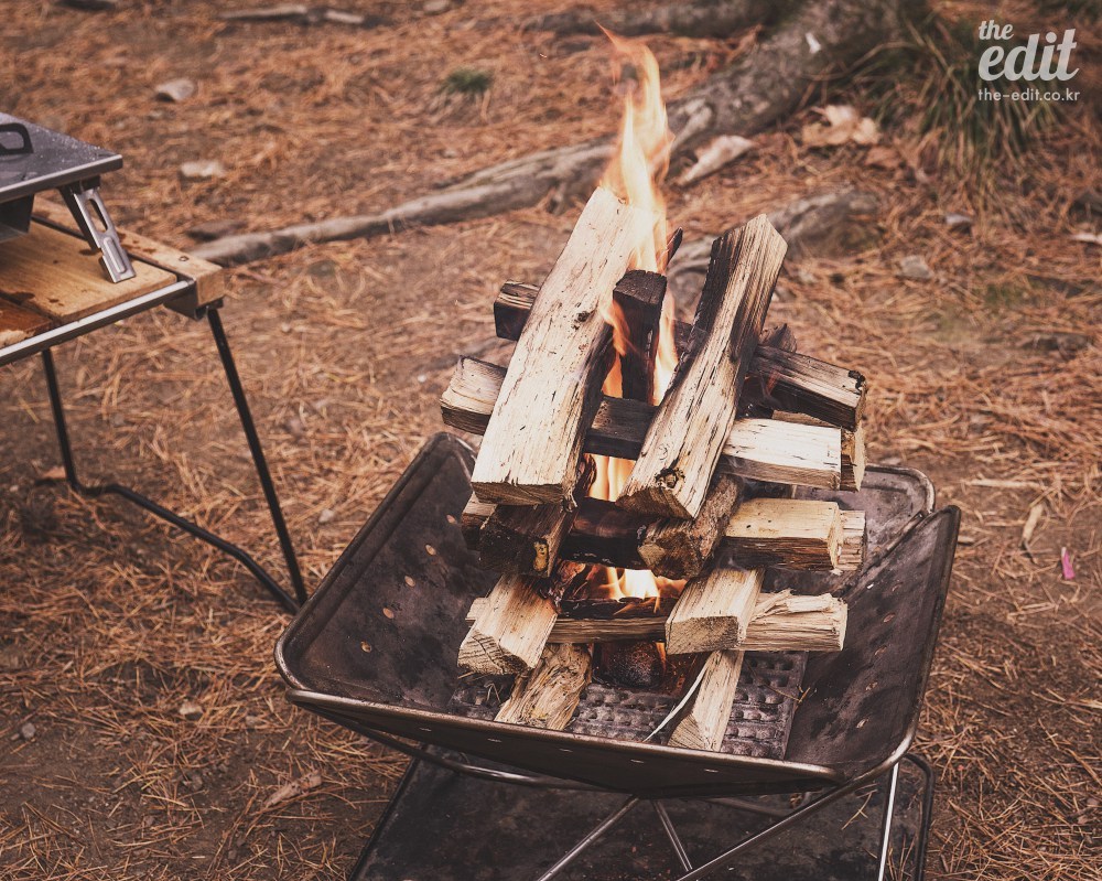기껏 불씨를 키워도 관리를 잘못하면 금새 사그러든다(내가 활활타고 있는 불을 많이 죽여봐서 안다). 일단 장작을 잘 쌓는게 포인트다. 산소가 통할 숨구멍을 만들면서 쌓아야 균일하게 활활 타오른다. 참고로 화로도 스노우피크 제품이다. 역사각뿔 형태라 불씨가 퍼지지 않고 잘 모이더라.