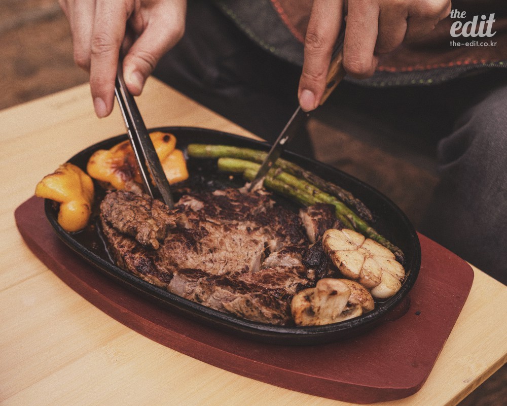 뜨겁게 달궈진 무쇠팬위에 버터 한 조각을 올리고 스테이크를 굽는다. 치익. 잣나무 숲에 비내리는 소리가 울려퍼진다. 아스파라거스와 파프리카, 양송이, 양파까지 올려 냠냠.