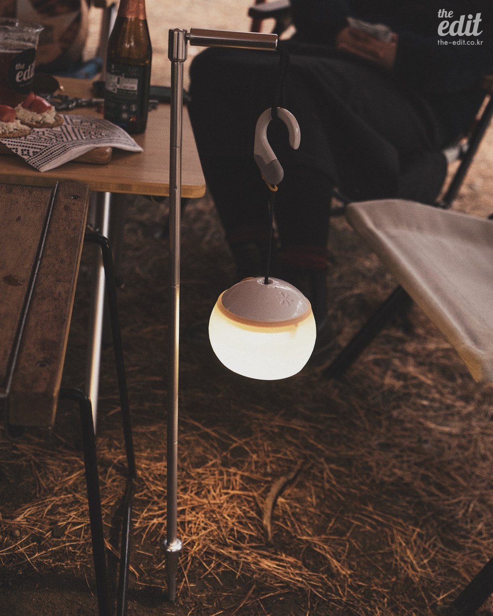의자 옆에선 호즈키 모리 램프가 은은하게 불을 밝히고 있다. 불바람에 반응하는 흔들림보드가 있어 주변이 고요해지면 불빛이 잦아들다 소란스러우면 다시 밝아진다. 꼭 작은 반딧불이처럼 작은 생명체 같다.우리의 테마였던 감성캠핑에 딱 어울리는 녀석이었다.