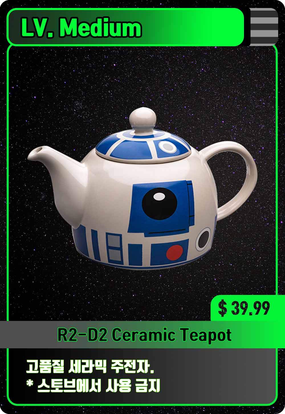 약 4만 4,000원 대. 스타워즈 팬을 집으로 초청할 때 매우 유용한 아이템. 같은 팬끼리 R2-D2의 귀여움을 논하며 티폿으론 따뜻한 차를 내어드리자.
