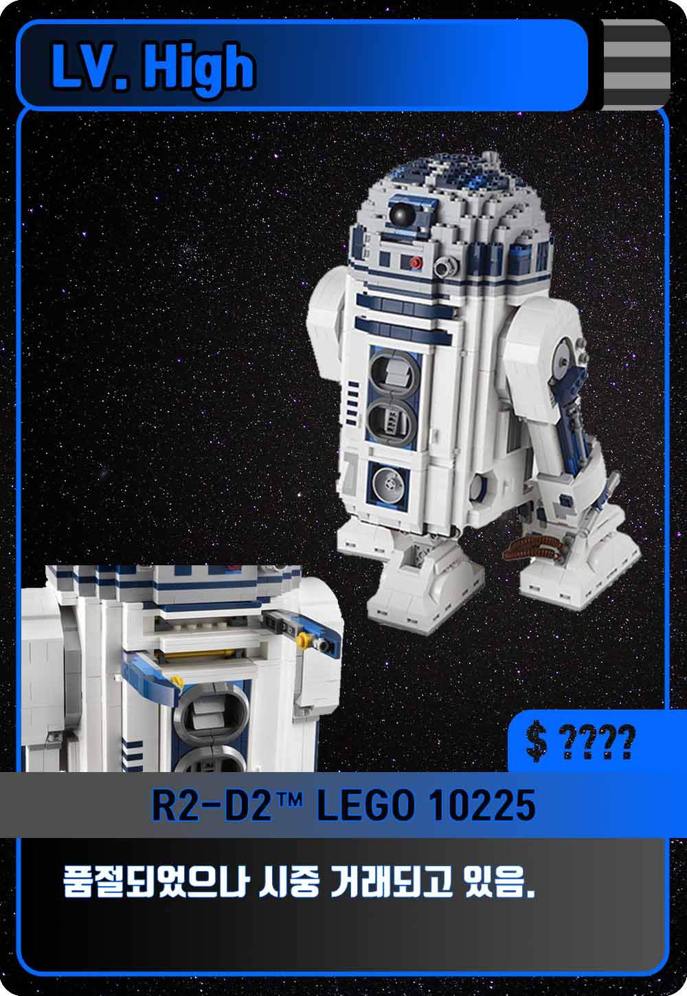 R2-D2 레고 10225는 현재 품절되었으나 중고로 구할 수 있다. 가격은 판매자에 따라 천차만별. 이베이를 뒤져보면 중고는 20만 원대부터, 미개봉 제품은 30만 원대부터 시작한다. 극 중 죽음의 별 설계도를 보관했던 R2-D2 보관함을 레고로 표현했다. 꼼꼼한 디테일이 돋보이는 아이템.