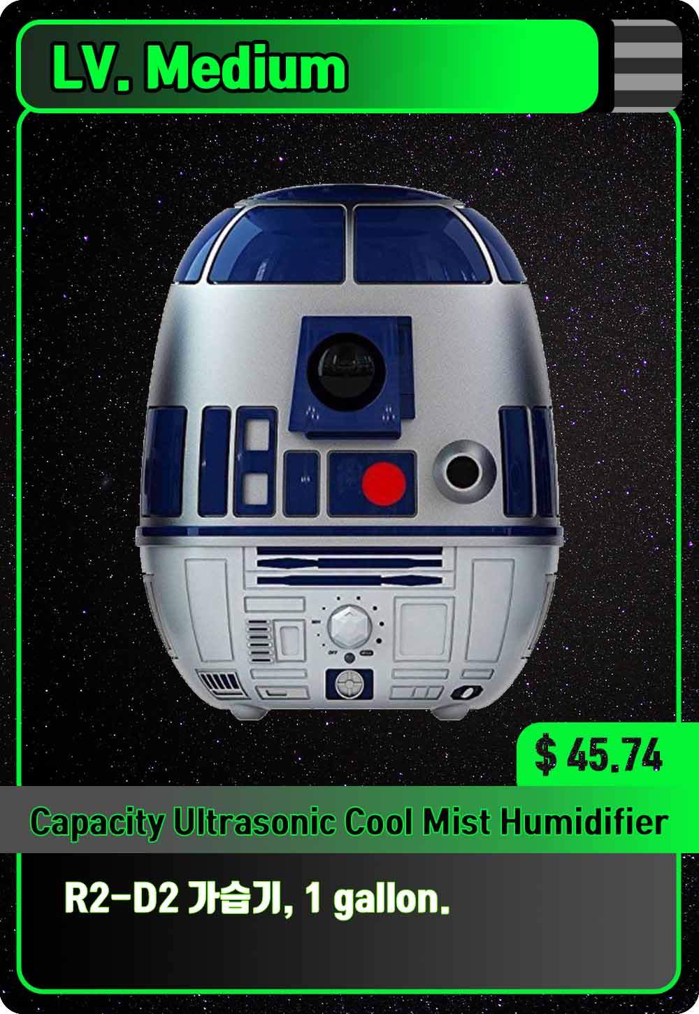 약 5만 원 대. 피규어로 써도 될 만큼 멋드러지게 만든 R2-D2가습기. 만약 이 가습기를 사서 쓰다 고장나버린다면 생각하자. “내가 예쁜 피규어를 샀구나” 따뜻한 겨울을 나기 위해 우리에게 필요한건 패딩, 난로, 귤 그리고 가습기지. 그러니까 이건 꼭 쓸모있는 아이템이다.