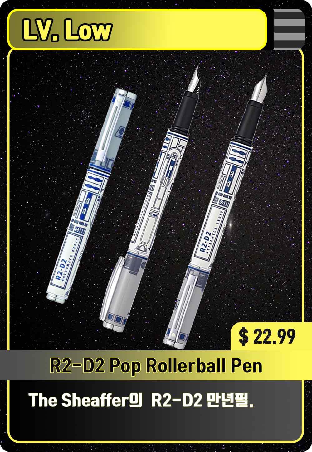 약 2만 5,000원 대. 만년필 본체에 적힌 R2-D2 ASTRONECH DROID를 읽어보지 않는 이상 일코가능한 아이템. 사람들은 당신이 R2-D2의 팬인 것을 알아차리지 못할 것이다.
