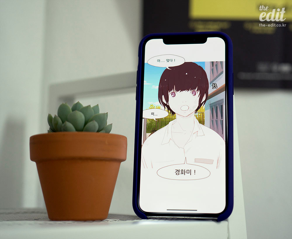 에디터M은 사랑스럽고 희미한 이목구비가 잘 표현됐다. 심지어 눈썹이 옅어서 그런지 눈썹에 스크래치 효과까지 있다. 전면 카메라로 담은 셀카를 분석해서 얼굴의 특징을 하일권 작가의 작화로 표현해내는 방식과 과정이 생각보다 매끄럽다.