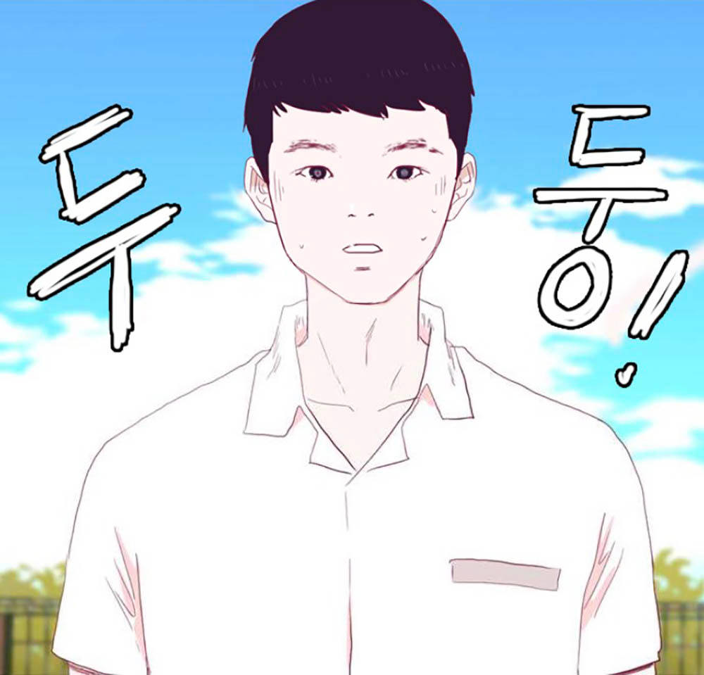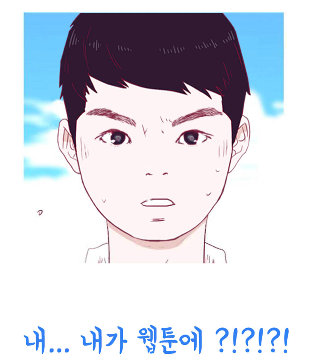 여기까진 제법 머리를 잘 쓴 기획이라고 생각했지만, 이 글을 쓰게 된 계기는 웹툰 2화에서 등장한다. ‘들어갔다’는 소제목처럼 만화 안에 내 얼굴이 들어간다. 영희 계집애가 아련한 표정으로 사진 찍어도 되냐고 부탁하길래 카메라 모드로 들어가 버리고 말았다. 주말 동안 기름진 민낯으로 스마트폰 화면을 들여다보던 내 얼굴이 화면에 뜨자마자 식겁하게 된다. 간신히 정신을 가다듬고 살짝 귀여운(??) 표정을 짓고 셀카를 찍었는데 웬걸. 이 캐릭터는 남자였다.
