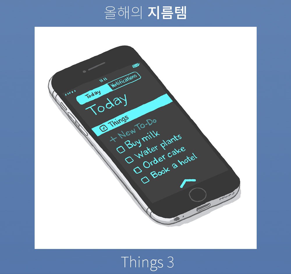 아이폰에서도 맥에서도 띵스3를 쓰고 싶다면, 10만원에 가까운 돈을 지불해야한다. 이걸 샀을 때(물론 디에디트 법카로 샀다) 에디터H에게 엄청난 째림을 받긴 했지만, 결론적으로 아주 만족하면서 쓰고 있다. 작년 디에디트 파티 준비때도, 디에디트 사무실을 구하고 차곡차곡 물건을 채워나갈 때도 띵스 3가 없었다면 난 아마 난 바닥에 주저 앉아 엉엉 울었을거다. 문제가 있다면, 매일 같이 쓰면서도 복잡한 기능은 거의 쓰지 않고 아주 단순한 TODAY 리스트만 깨작대고 있다는 것. 하지만 내가 쓰지 않는다고, 다양한 기능이 있는 이 앱의 가치가 없는건 아니다. 뭐, 언젠가는 쓰겠지.