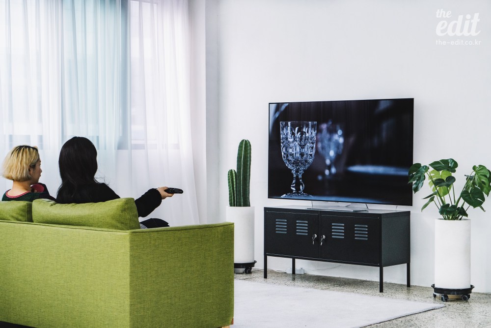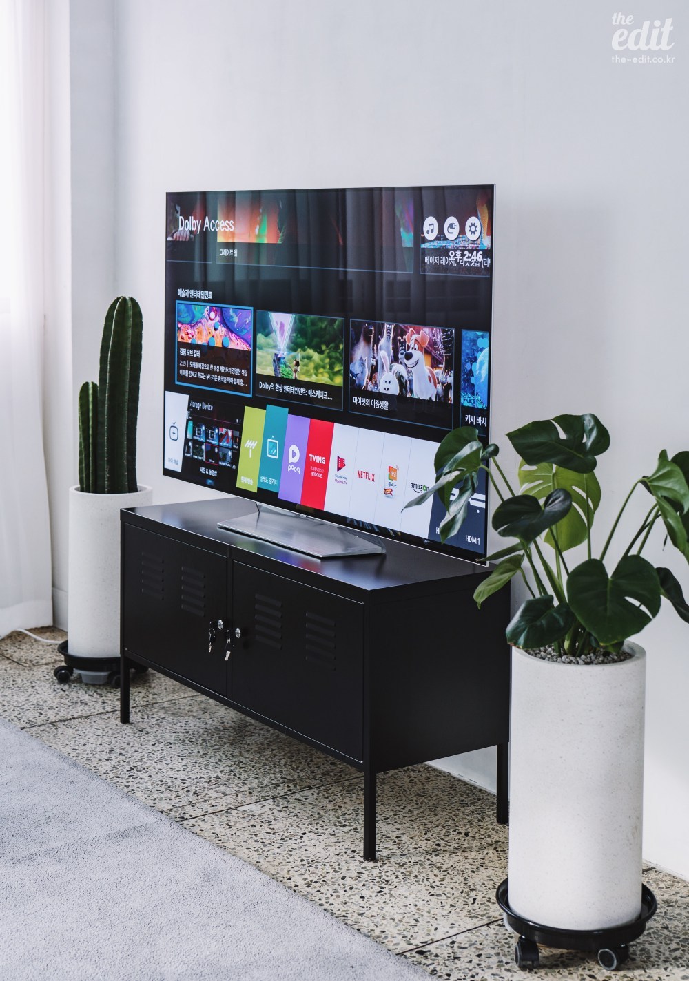 두근거리는 마음으로 리뷰 제품을 기다렸다. TV가 사무실에 도착했을 때는 디에디트의 세 에디터가 모두 모여 입을 떡 벌리고 호들갑을 떨었다. 내 키만한 박스가 당도했고, 그 안에서 칼날처럼 얇은 TV가 나왔다. 설치 기사님이 TV를 세우는걸 도와달라고 했을 땐 다들 겁을 먹었을 정도다. 너무 얇아서 손대면 부러질까봐. 다행히 가장 용감한(?) 막내 에디터가 그 역할을 맡았다. 기사님은 튼튼하니 걱정하지 말라고 껄껄 웃고 떠나셨다. 본래는 전자레인지가 올라가있었던 철제 TV장 위에 65인치 올레드 TV를 올려놨다. 아, 크고 아름다웠다.