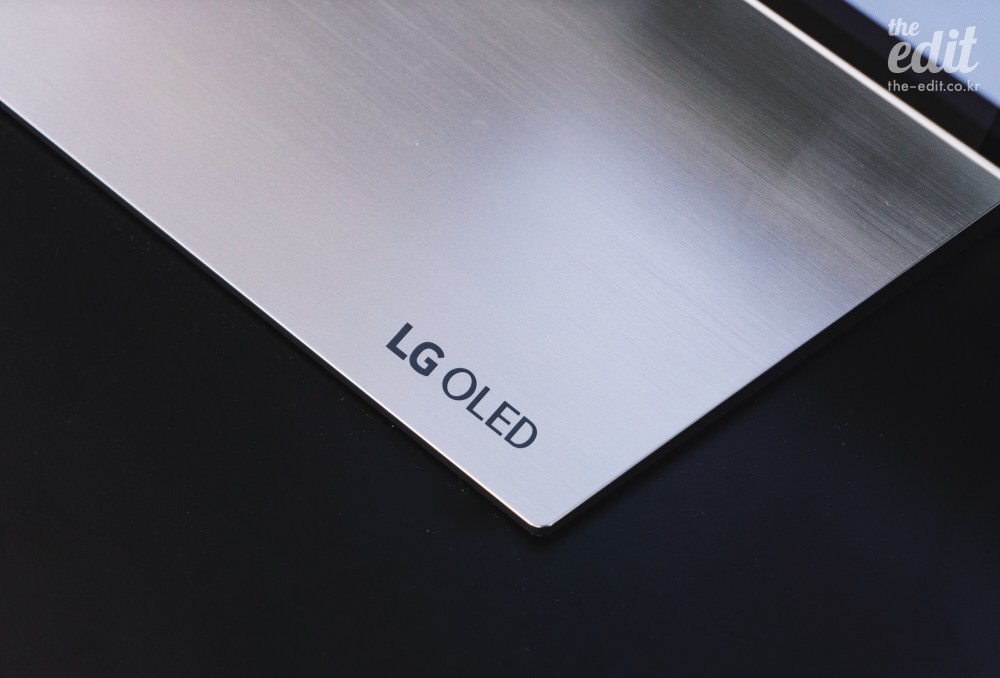 옆모습은 아슬아슬하다. 어쩜 이렇게 얇을까. 좋은 비교대상을 찾지 못해 고민하다가 연필 한 자루를 옆에 대고 촬영해봤다. TV 쪽이 승리다. 고작 4mm 정도 되는 두께 덕분에 디자인과 기술 모두에 경탄하게 된다.