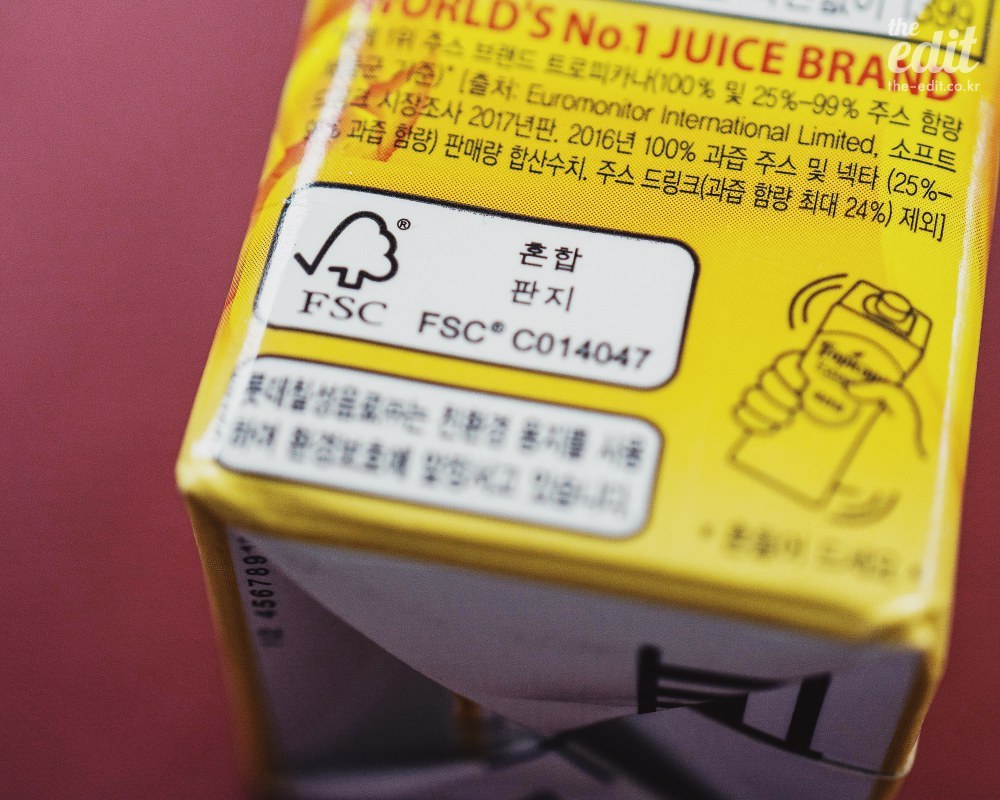 ‘소중한 것을 지킵니다(Protects What’s Good)’. 테트라팩의 모토다. 그들이 말하는 소중한 것은, 팩 안에 든 내용물을 의미하기도 하지만 우리가 살고 있는 지구를 의미하기도 한다. 특히 친환경 인증의 종결자라고 불리는 ‘가공·유통 FSC(Forest Stewardship Council™) 인증을 받았다. 나무를 심는 숲의 목재를 사용한 제품에만 부여하는 인증이다. 결국 테트라팩에 담긴 음료를 사는 건 지구에 나무를 심는 거라고 말해도 거짓말이 아니다.