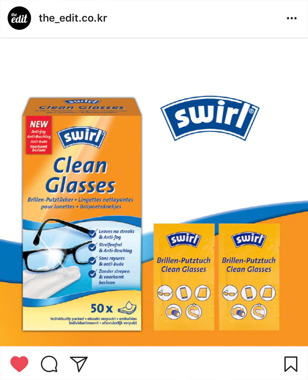 나는 안경을 끼지 않는다. 하지만 주변에 안경이 또 하나의 눈인 사람들을 보면 겨울철 실내에 들어설 때마다 뽀얗게 서린 김때문에 멋쩍은 적이 한 두 번이 아니더라. 뭐든 잘 만드는 독일에서 온 주방가전브랜드 스월(swirl)이 김서림 방지가 되는 티슈를 선보였다. 한 장씩 포장되어 있어 가방에 가지고 다니다가 안경이 더러워지거나 아 곧 내 안경에 김이 서리겠다 싶을 때마다 뽀득뽀득 닦아주면 된다. 제품의 성능만 보여주는 근래 보기드문 투박한 패키지 디자인 덕분인지 퍽 믿음이 간다. 유용할 것 같으니 하트는 켜두겠다. 뿅!