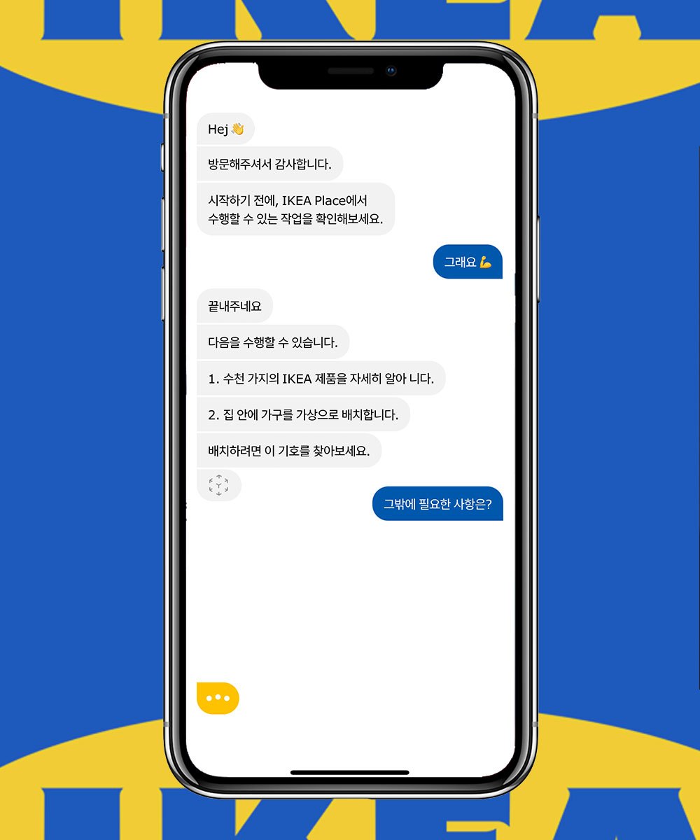 앱을 시작하면 이케아가 말을 걸어온다. 메시지 형태의 UI가 친절한 느낌을 준다. 종종 지나치게 자세해서 귀찮기 일쑤인 튜토리얼을 이렇게 메시지를 주고받는 방식으로 하니 꼭 AR이 아니라 AI 앱을 사용하는 기분. 단 한 가지 아쉬운 점은 좀 더 번역이 매끄러웠다면 좋았을걸. 한국말에 서툴어 보인다.