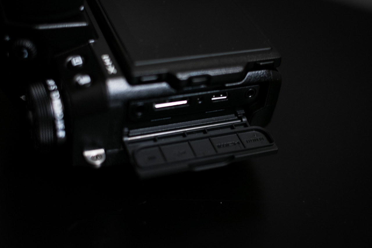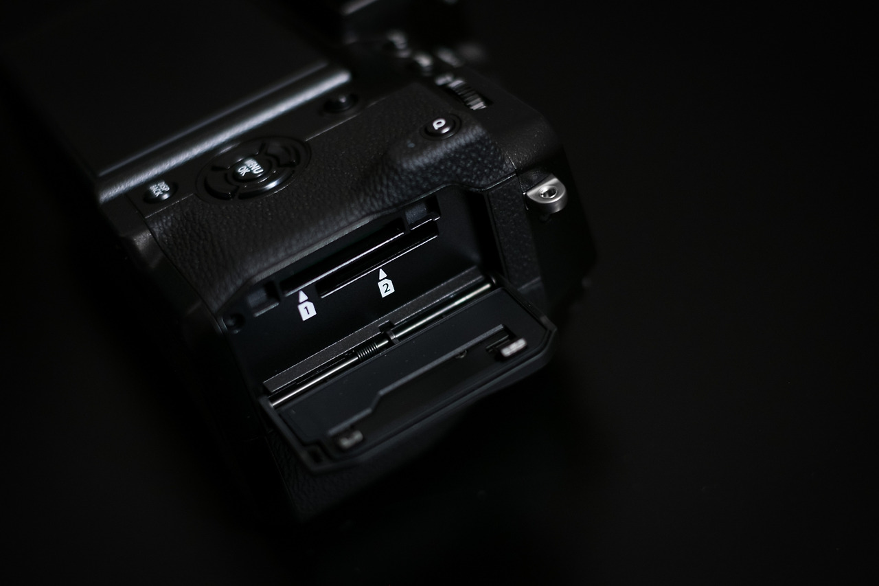 측면에는 카드 슬롯이 있는데 X-T2와 마찬가지로 듀얼 SD를 지원하고, 최대 uhs-ii SD카드를 두개 넣고 사용할 수 있는데 이는 사용자마자 방식을 바꿔 사용할 수 있다. jpg로 차례대로 채워가며 쓸 수도 있고, 한쪽은 jpg, 한쪽은 raw파일로 저장도 가능한데 사용자가 편한대로 사용하시면 된다.