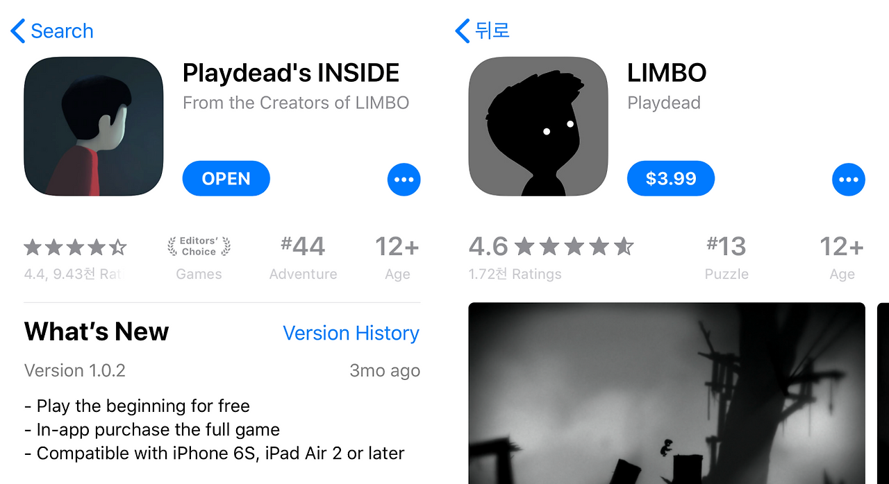 앱스토어 기준으로 다운로드 용량은 1.3GB. 아주 평온한 어드밴처 게임처럼 보이지만 놀랍게도 12세 이상 관람가(?)야. 가끔 주인공 캐릭터가 잔인한 최후를 맞이하는 경우가 있거든.