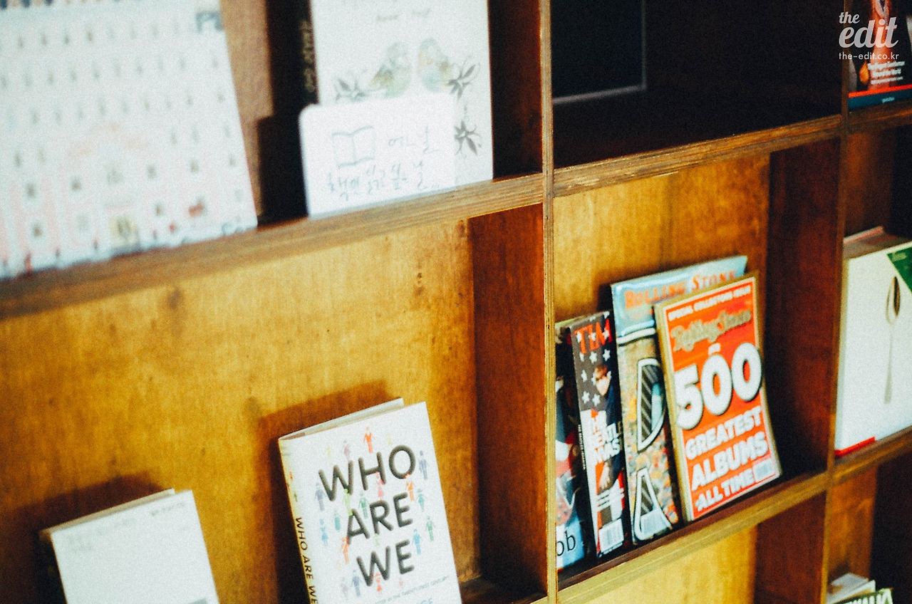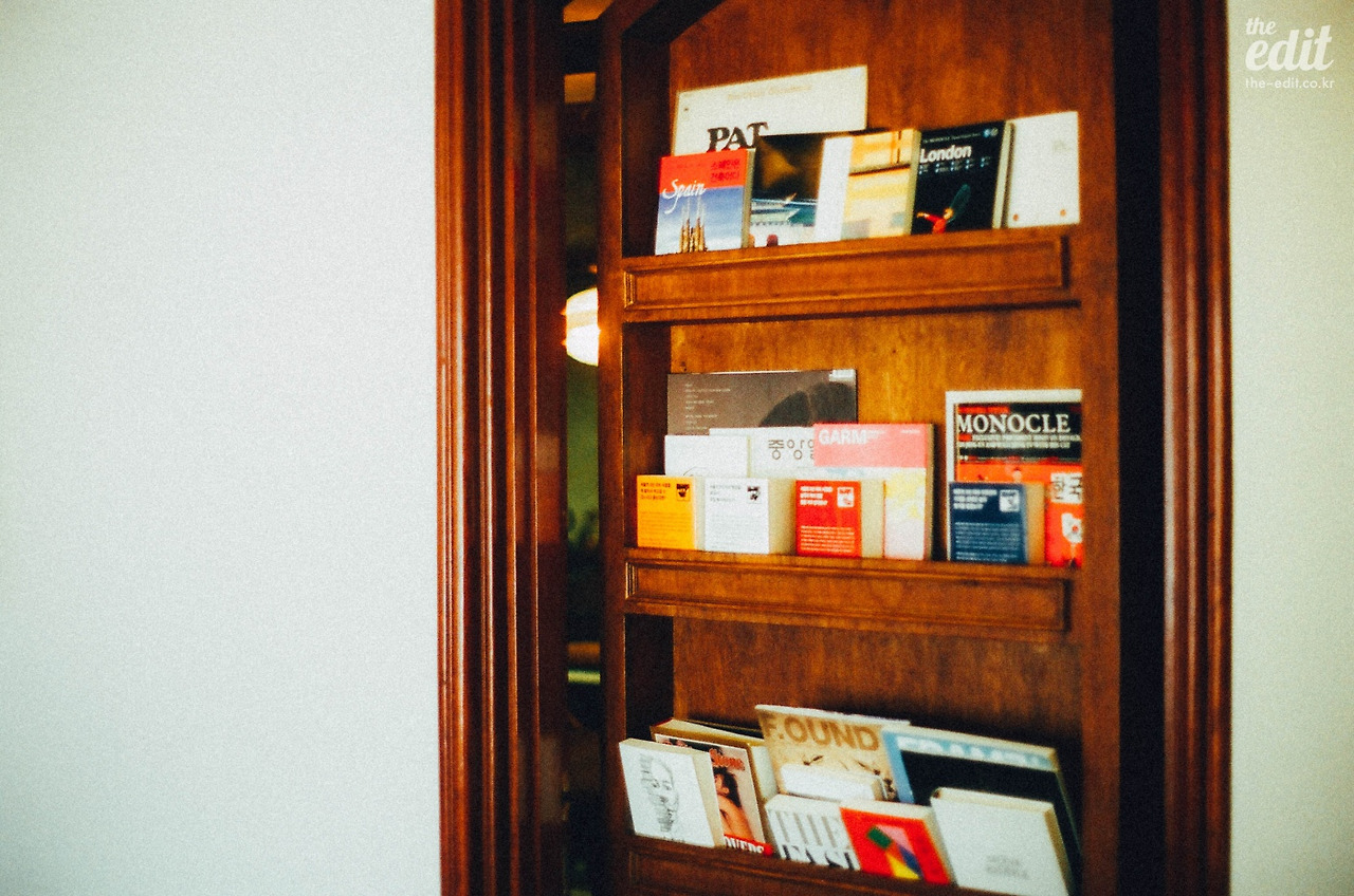 공간 곳곳에는 책과 잡지가 꽂혀있었다. 1층 로비에 있는 책꽂이에도(영화 <킹스맨>에서 보던 것 처럼 책꽂이를 밀면 비밀의 방이 나타난다!), 2층으로 올라가는 계단에도 책과 잡지들이 보였다.