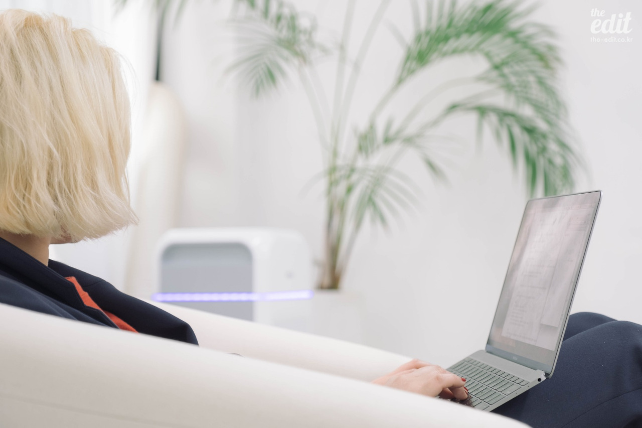 여러분, 바로 이때가 환기청정기 비채가 필요한 순간이다. 테이블 근처에 있던 소파를 비채 근처로 옮기고 노트북을 무릎에 올려두고 일을 하기 시작한다. 기분탓일 수도 있겠지만 깨끗한 공기에 가까이 있으니 집중력이 높아지고, 능률이 오른다. 타닥타닥. 손놀림도 가볍다. 실제로 이산화탄소 측정기를 사용해보니 비채를 켜두고 일정 시간이 지나면 이산화탄소 수치가 눈에 띄게 내려간다. 신선한 산소도 공급해 준다고.