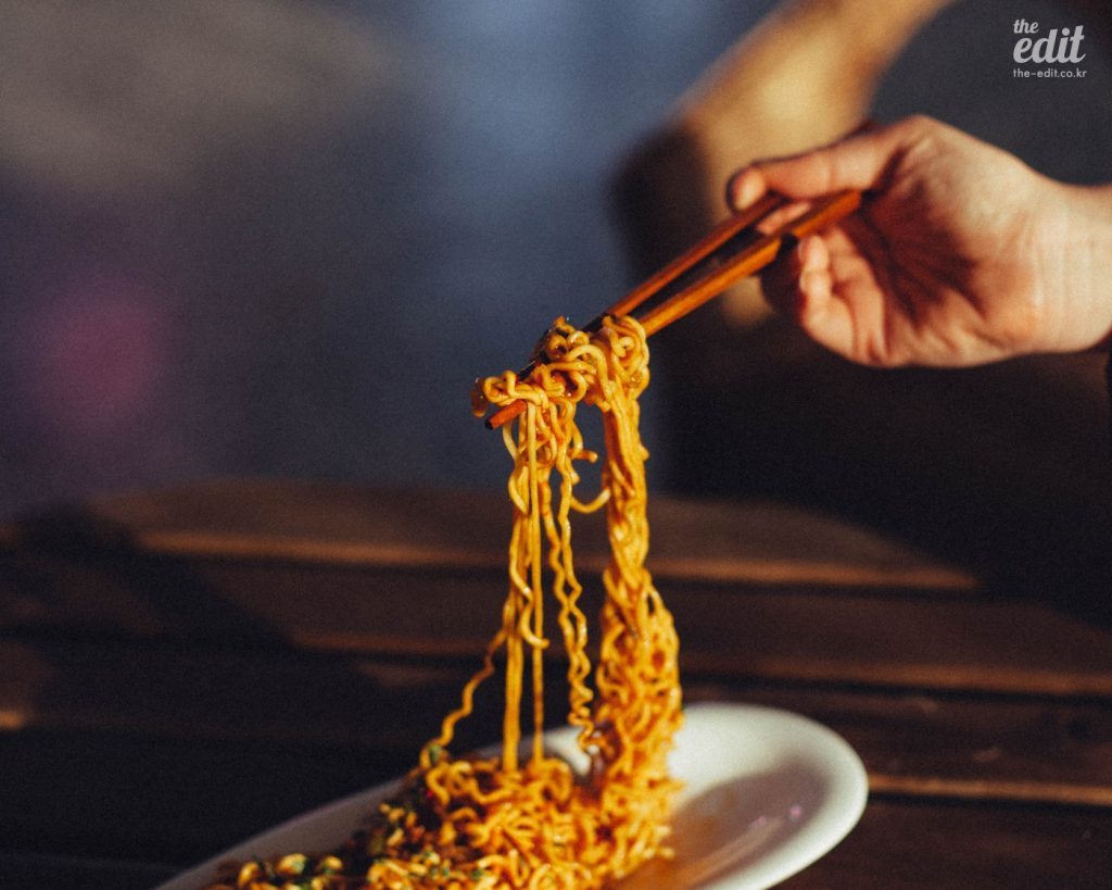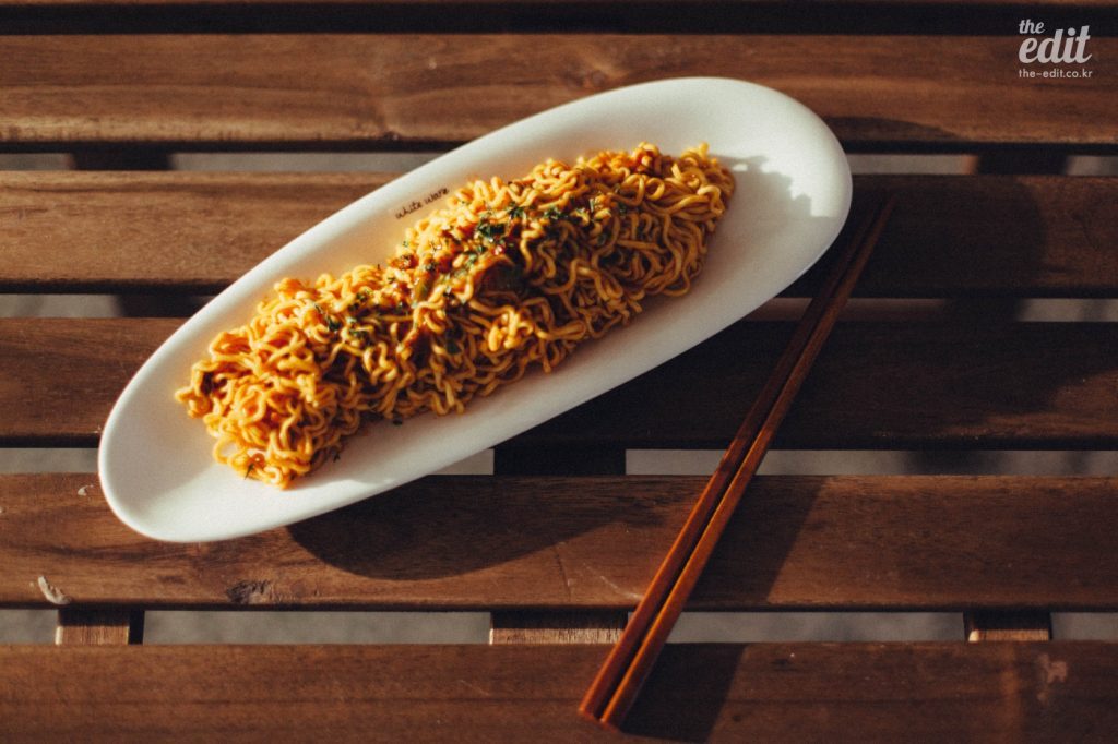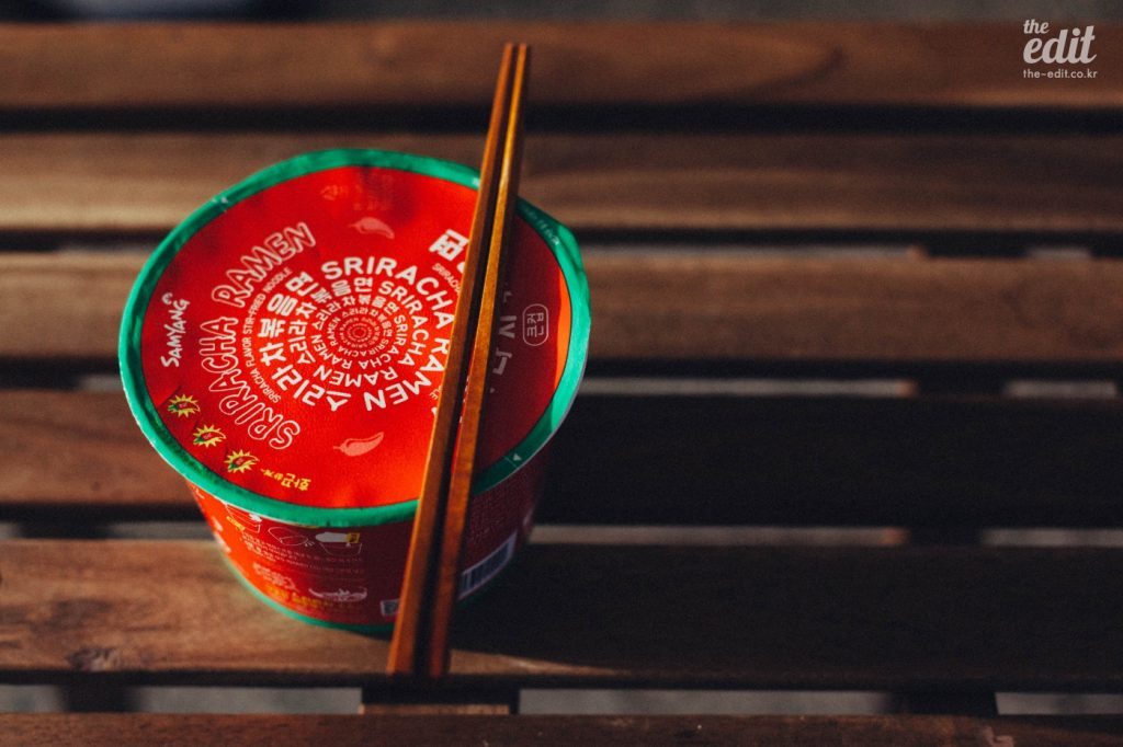플레이팅도 했다. 편의점에서 파는 라면이지만, 이렇게 차려먹으면 기분이 좋다. 처음 맛봤을 땐 솔직히 조금 실망스러웠다. 불닭볶음면과 크게 다르지 않은 편의점 라면의 맛이 강하게 느껴진달까. 그런데 한 입 한 입 면발이 입속에 들어갈수록 스리라차 특유의 맛이 그대로 느껴진다. 시고 달고 맵고 혀로 느낄 수 있는 모든 맛이 여기에 있다. 맵고 시고 짜고 달고 혼자 다해먹는다. 동남아의 향기가 물씬. 더운 나라 특유의 향과 산미가 있다. 이 향을 좋아하는 나는 눈물을 흘리면서 면발을 흡입하고 만다.