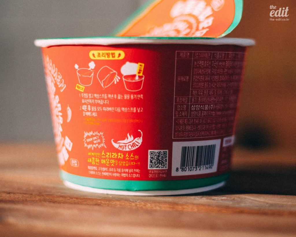 아주 혼을 쏙 빼는 디자인이다. 자기 주장이 강한편이랄까. 혹시나 사람들이 이게 스리라차 볶음면인걸 까먹을까봐 사방팔방 자신의 존재를 써놨다. 입맛 돋우는 빨간색에 초록 뚜껑을 형상화한 테두리가 아주아주 인상적이다.