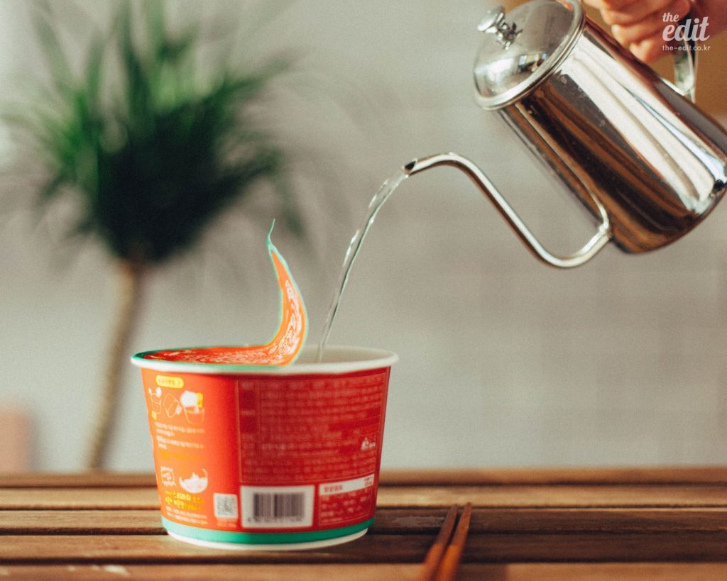 자 이제 물을 붓고 면을 익혀보자. 굳이 전기 포트로 끓인 물을 사무실에 있는 핸드드립용 주전자에 담아 우아하게 부어본다. 섬세하게 떨어지는 물줄기가 아름답다. 자 이제 길고 긴 4분의 기다림만 견디면 새빨간 볶음면을 맛볼 수 있다.