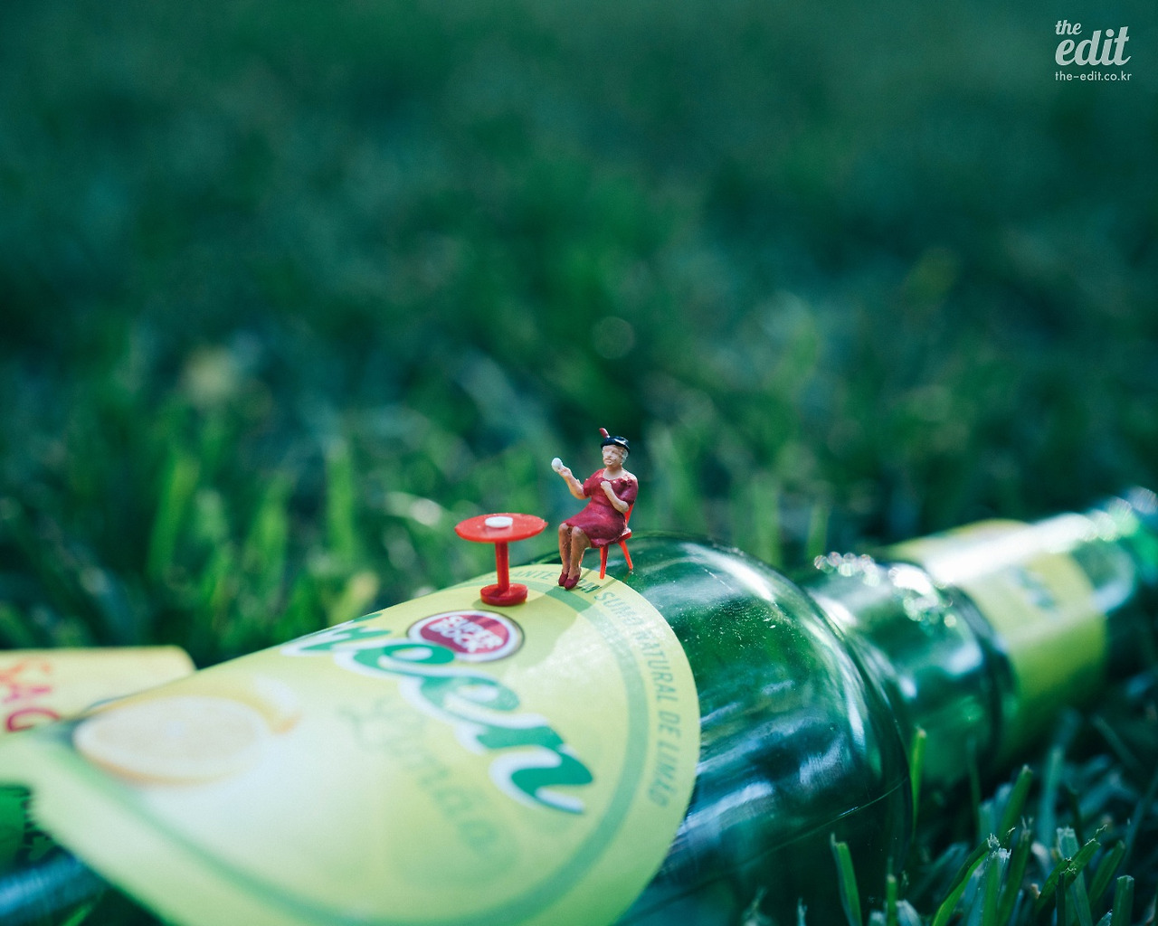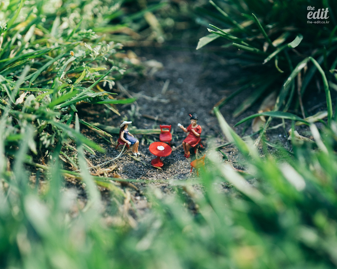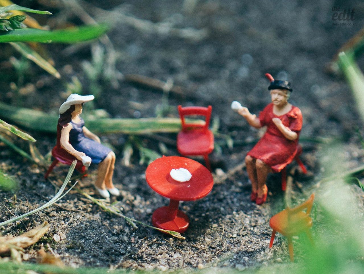 일단 조심스럽게 우아한 두 여자의 티타임을 연출해봤다. 이 과정에서 두 가지 문제가 있었다. 이 피규어가 너무 작아서 잔디밭이 두 사람을 덮칠 것처럼 보인다는 사실. 우아한 정원이 아니라 정글 속의 티타임처럼 공포스러웠다. 게다가 초점 맞추는 게 쉽지 않다. 나의 자부심(?)인 매크로 렌즈까지 꺼내들었지만 피규어 얼굴에 완벽하게 초점이 맞은 사진을 건지기가 어렵더라. 이대로 촬영하다가는 잔디밭에 엎드리게 될 것 같다.