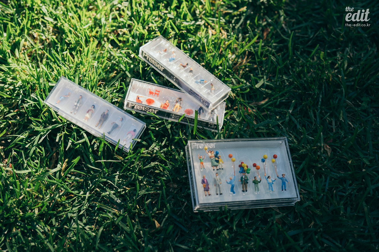당장에 손가락 한 마디보다 더 작다는 피규어 ‘프레이저’를 여섯 세트나 주문했다. 프레이저는 초소형 피규어를 제작하는 독일 브랜드다. 장난감처럼 보이지만 주로 건축 모형에 사용하기 때문에 디테일이 끝내주는 편이다. 휠체어를 탄 사람, 스키 타는 사람, 피크닉 중인 사람, 시장의 상인… 피규어 종류도 놀라울 정도로 많다. 국내 쇼핑몰엔 내가 원하는 시리즈가 없어서 아마존 직구까지 했다. 두근두근. 포르투까지 야무지게 들고 와서 집앞 공원의 잔디밭 앞에 풀어놓은 프레이저는 생각하던 것보다 더 작았다. 내가 구입한 건 1:87 비율인데, 눈으로 보고 즐기기도 어려울 만큼 작다.