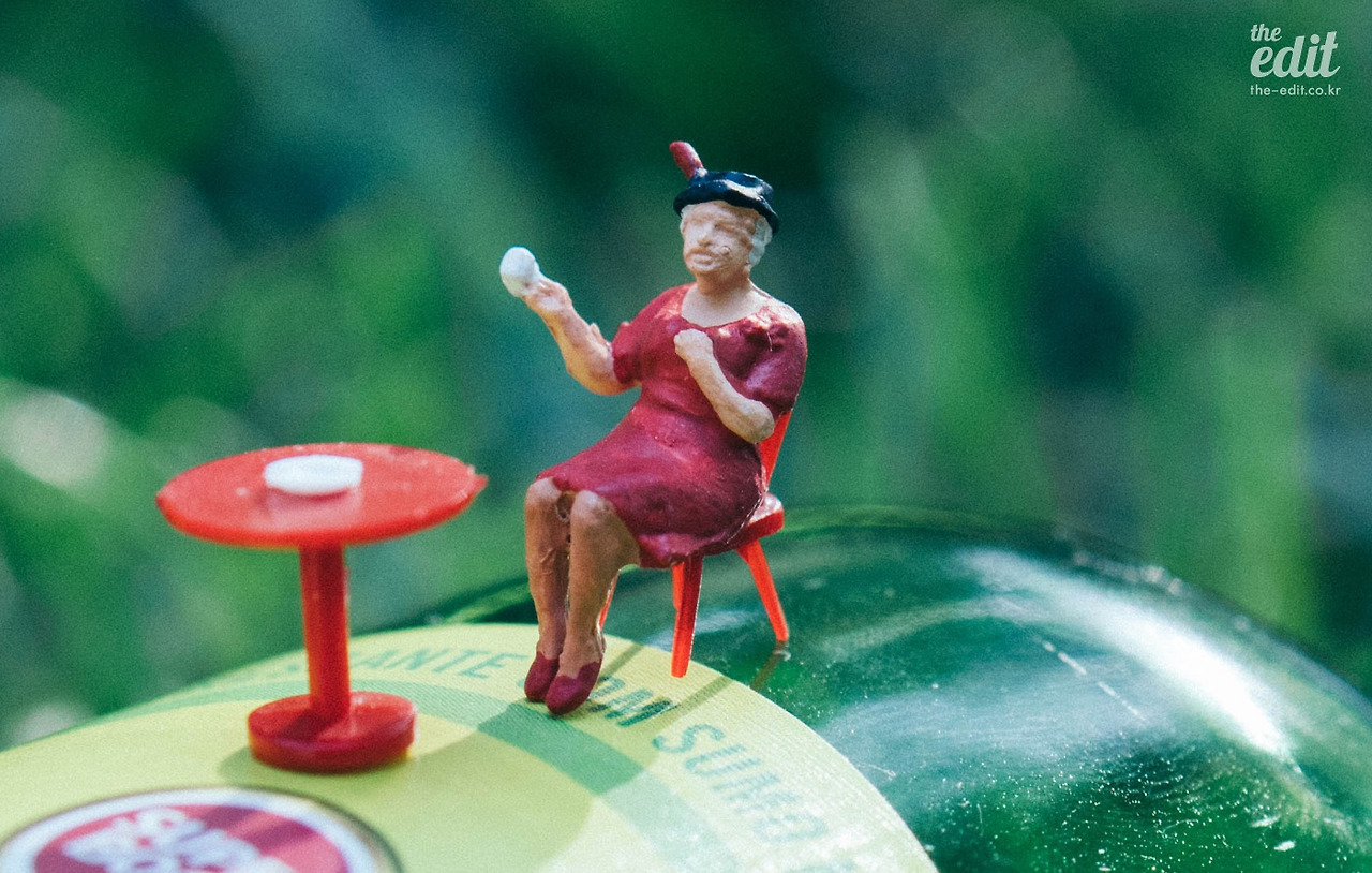 촬영 장소를 다른 곳으로 옮기려고 조심스럽게 피규어를 들어 올렸는데…! 앗, 이쑤시개보다 더 가느다란 플라스틱 의자 다리가 몽땅 부러졌다. 한순간의 힘 조절 실패로 흰 모자를 쓴 귀부인 피규어는 저세상으로 가버렸다. 잔디밭에 떨어진 의자 다리를 바라보는 마음이 황망하기 그지 없다. 저쪽에서 에디터M이 작은 눈으로 흘겨본다. 사달라고 유난을 떨어서 결제해줬더니 개봉 5분 만에 망가트린 나를 힐난하는 게 틀림없다.