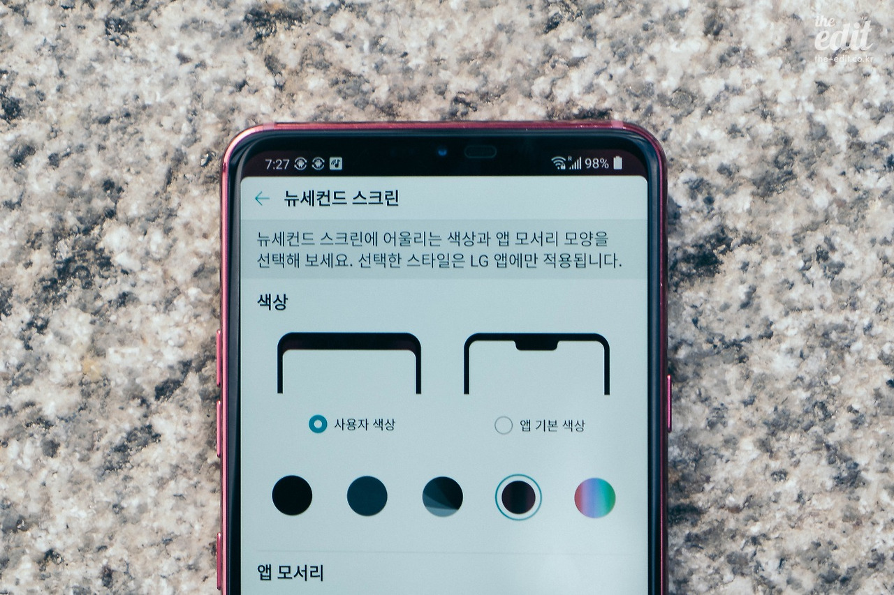 LG전자는 G7 ThinQ의 상단 디스플레이를 ‘뉴 세컨드 스크린’이라고 칭했다. 사라졌던 세컨드 스크린의 부활을 뜻하는 네이밍이다. 입에 익는 명칭은 아니지만, 일단 설정 기능을 살펴보자. 상당히 소비자의 눈치를 많이 봤다. 이 디스플레이를 선호하지 않는 사람도 거부감 없이 사용할 수 있도록 다양한 옵션을 제공한다. 상단 바에 컬러를 채워넣어서 눈에 띄지 않게 블랙 디스플레이로 설정하고 알림 아이콘 들만 표시할 수 있다. 다양한 컬러 옵션과 앱 기본 색상 중 선택할 수 있는데, (내 취향은 아니지만)자줏빛 그라데이션 컬러 색상이 재밌다. 노치 부분에 검은색 그라데이션을 적용해 가운데 부분의 화면이 잘려있다는 느낌을 주지 않는다. 사소하지만 세심히 신경쓴 요소다. 심지어 앱 모서리의 곡률도 만질 수 있다. 설정의 자유도가 높은 점은 칭찬하고 싶다.