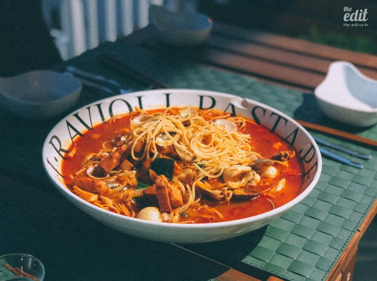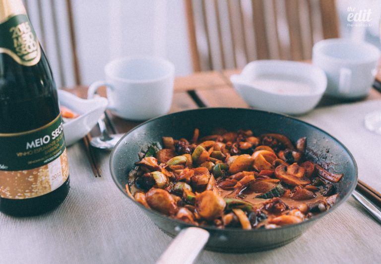 이 새빨간 국물은 야심차게 준비한 메뉴. 짬뽕 파스타다. 고춧가루와 마늘을 달달 볶아 불맛을 내고, 통 베이컨도 함께 볶아준다. 국물은 꼴뚜기와 조개를 원 없이 넣어서 진하게 우려냈다. 너무 맛있어서 코박고 먹었다. 빨간 국물에 집착하는 건 빨간 피가 흐르기 때문이라며 헛소리를 해보고. 이 날은 에디터M이 한국에서부터 곱게 모셔온 문배술을 오픈했다. 역시 궁합이 좋더라. 물론 와인도 마셨다. 그건 그거대로 궁합이 좋았다.