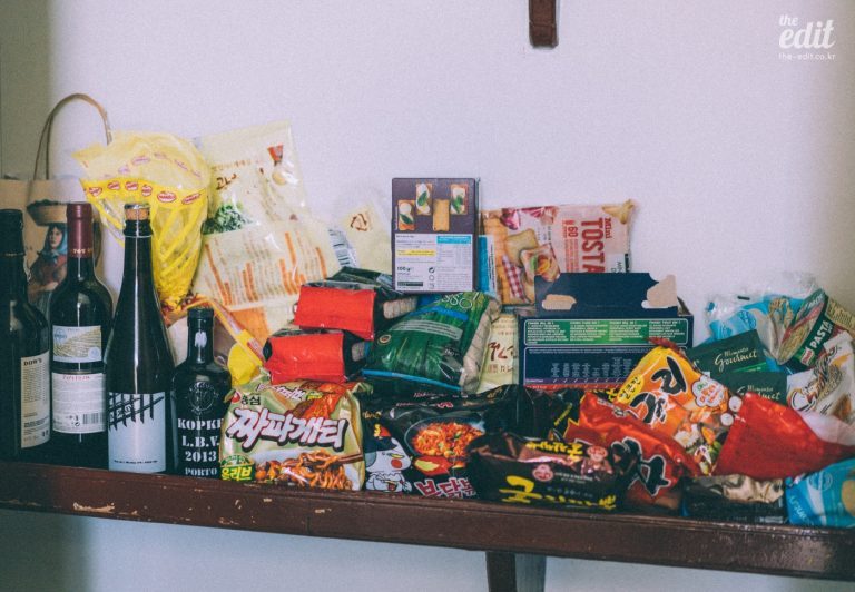 이번엔 한 번도 공개한 적 없는 은밀한 장소, 우리의 음식 창고다. 어두운 벽장처럼 숨겨진 공간이 있는데 여기에 상하지 않는 식재료를 몽땅 쌓아두었다. 봉지라면을 23개나 챙겨온 에디터H의 집요함이 들통나는 순간이다. 짜파게티, 불닭볶음면, 신라면, 너구리, 굴짬뽕… 라면 라인업도 밸런스를 지키며 선별하느라 힘들었다. 여기에 크래커와 식빵, 레드 와인이 합세해 은밀하면서도 달콤한 분위기를 풍긴다. 오른쪽엔 막내 에디터가 사모은 뻥튀기 같은 과자들이 잔뜩 쌓여있다. 문을 열 때마다 행복해진다. 우린 부자구나.