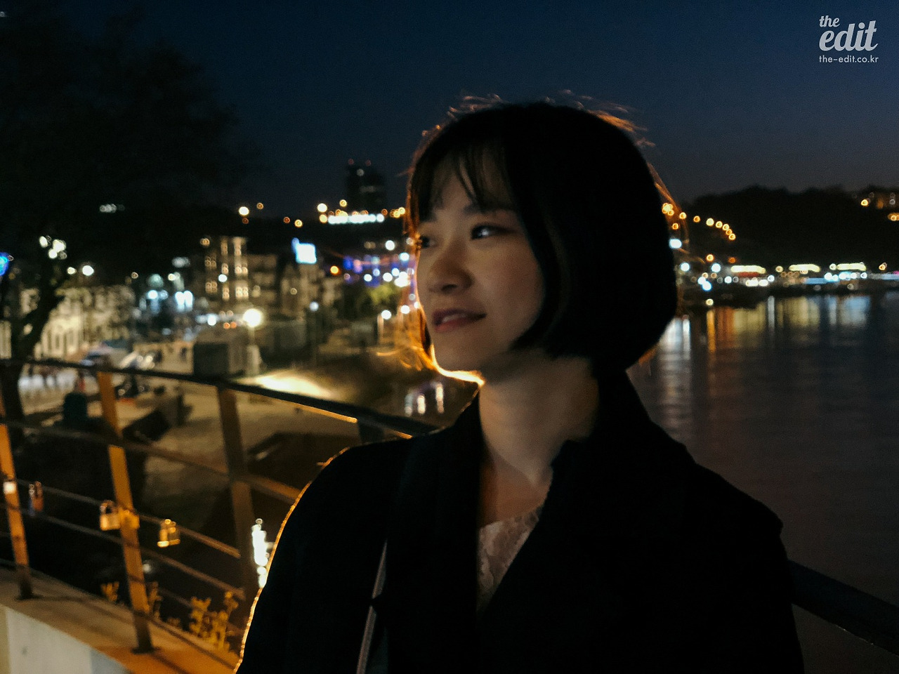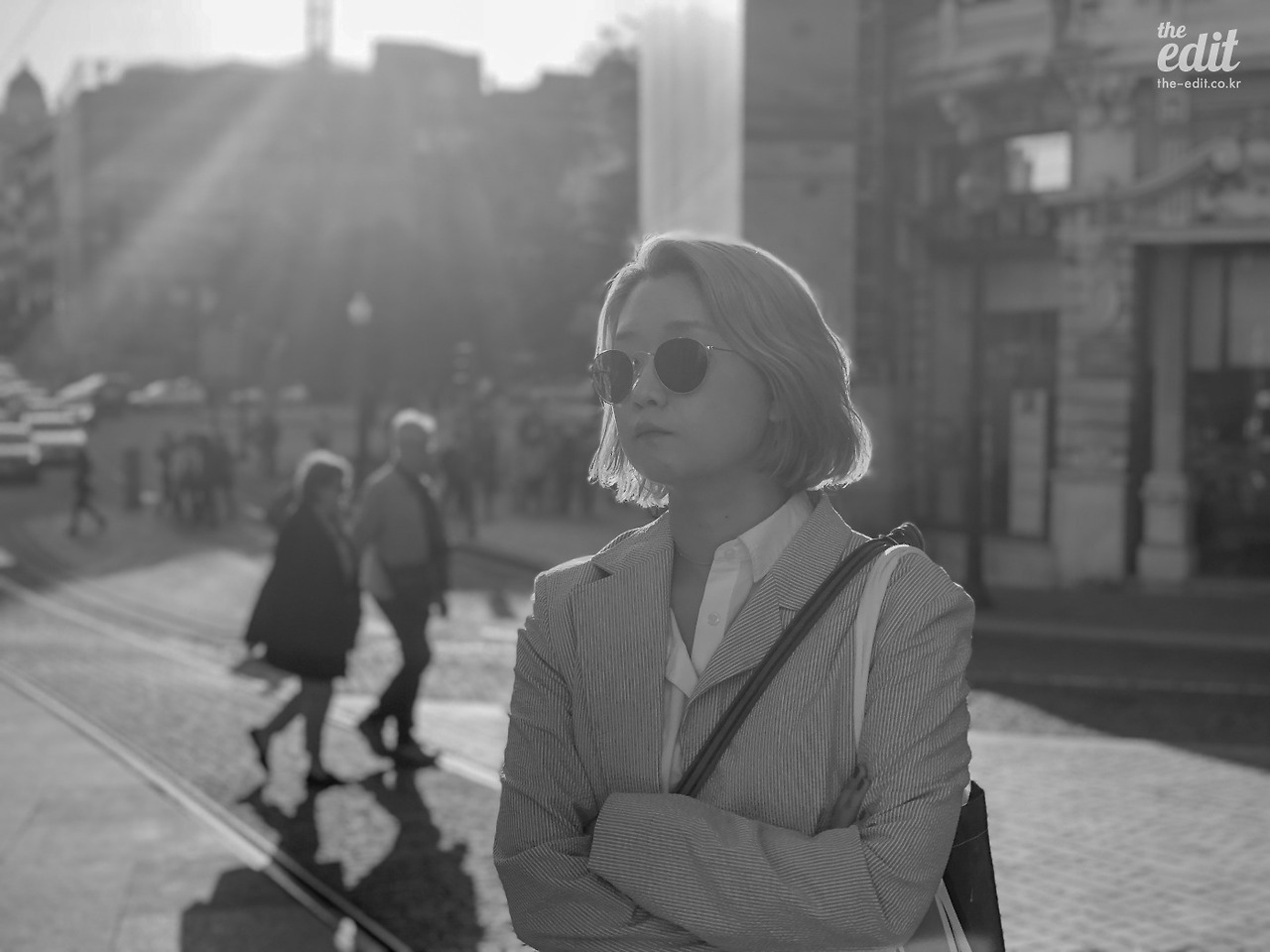 해 질 무렵에 촬영한 에디터M의 독사진. 이 사진을 찍고 인물 사진 모드의 위대함에 취해버렸다. 빛이 너무 세서 선글라스 없이 해를 마주하기 힘들 만큼 역광이었는데, 덕분에 사진은 더 근사하게 나왔다. 그녀의 얇은 머리카락을 따라 햇살이 스며든 게 참 예쁘다. 어쩌다 흑백 필터를 씌워봤는데 마음에 들어서 이렇게 보정했다.