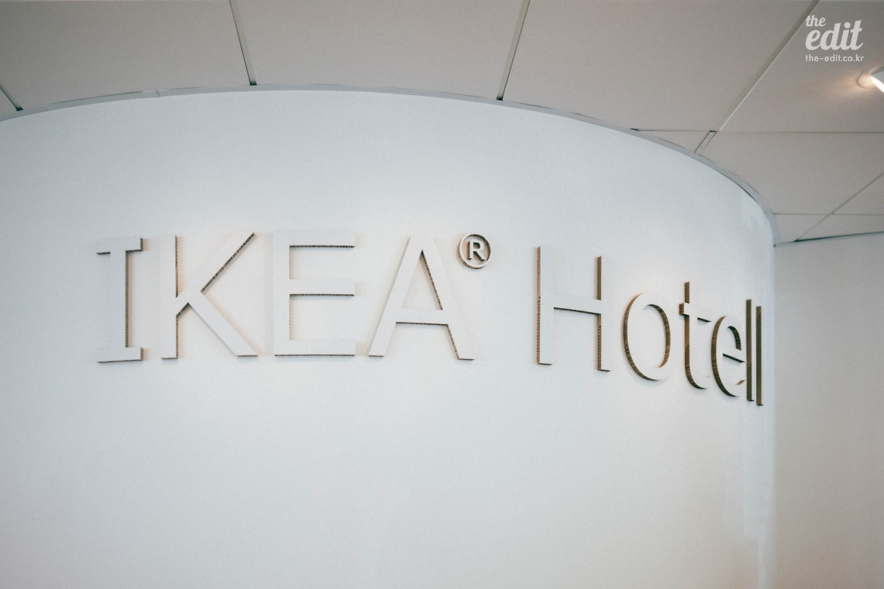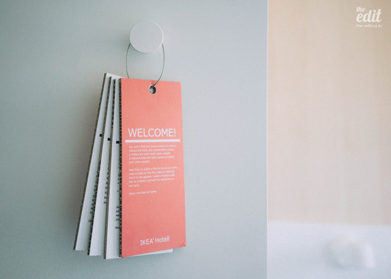 로비는 호텔의 상징과도 같은 곳이죠. 특히 체크인과 체크아웃을 하는 프론트 데스크는 호텔의 얼굴 아니겠어요? 다른 호텔들은 프론트 데스크에 가장 멋스럽고 호화스럽게 호텔의 이름을 새기곤 하잖아요. 그런데 이케아 호텔 프론트 데스크엔 이름을 카드보드지로 만들었더라고요. 종이라니… 이보다 검소할 수 있을까요?