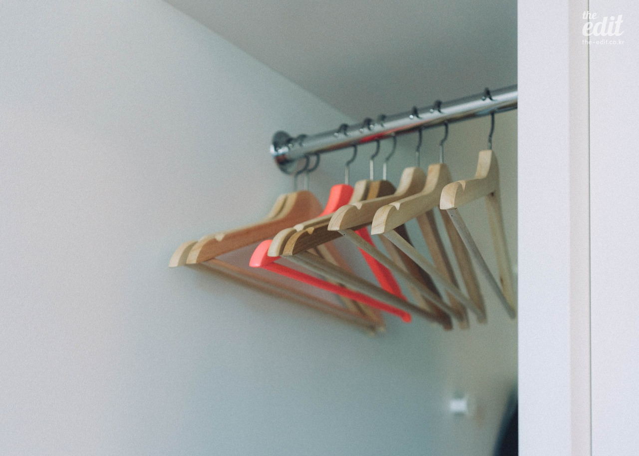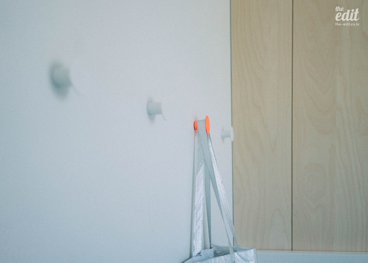 방은 전체적으로 무채색과 원목으로 마감해 단정해 보이는 인상을 풍기는데, 조금 더 자세히 살펴보면 귀여운 디테일이 보여요. 이케아 호텔의 포인트는 바로 네온 핑크 컬러였어요. 열 개 정도 되는 옷걸이 중에 네온 핑크 컬러 옷걸이가 딱 한 개 섞는다거나. 벽에 간단히 재킷이나 가방 등을 걸어둘 수 있는 벽 고리에도 이렇게 네온 컬러 포인트를 주는 거죠. 상당히 귀엽지 않나요?