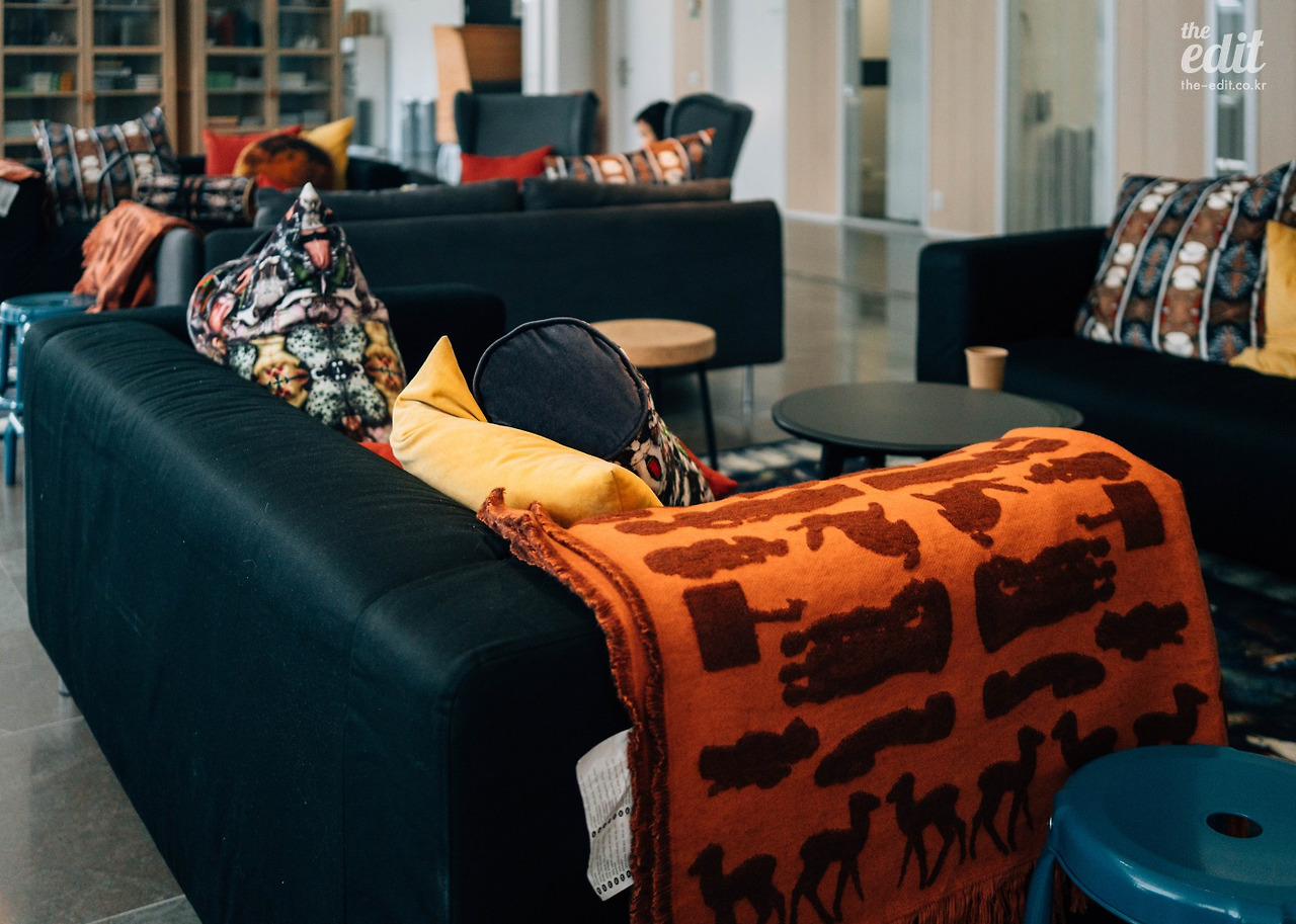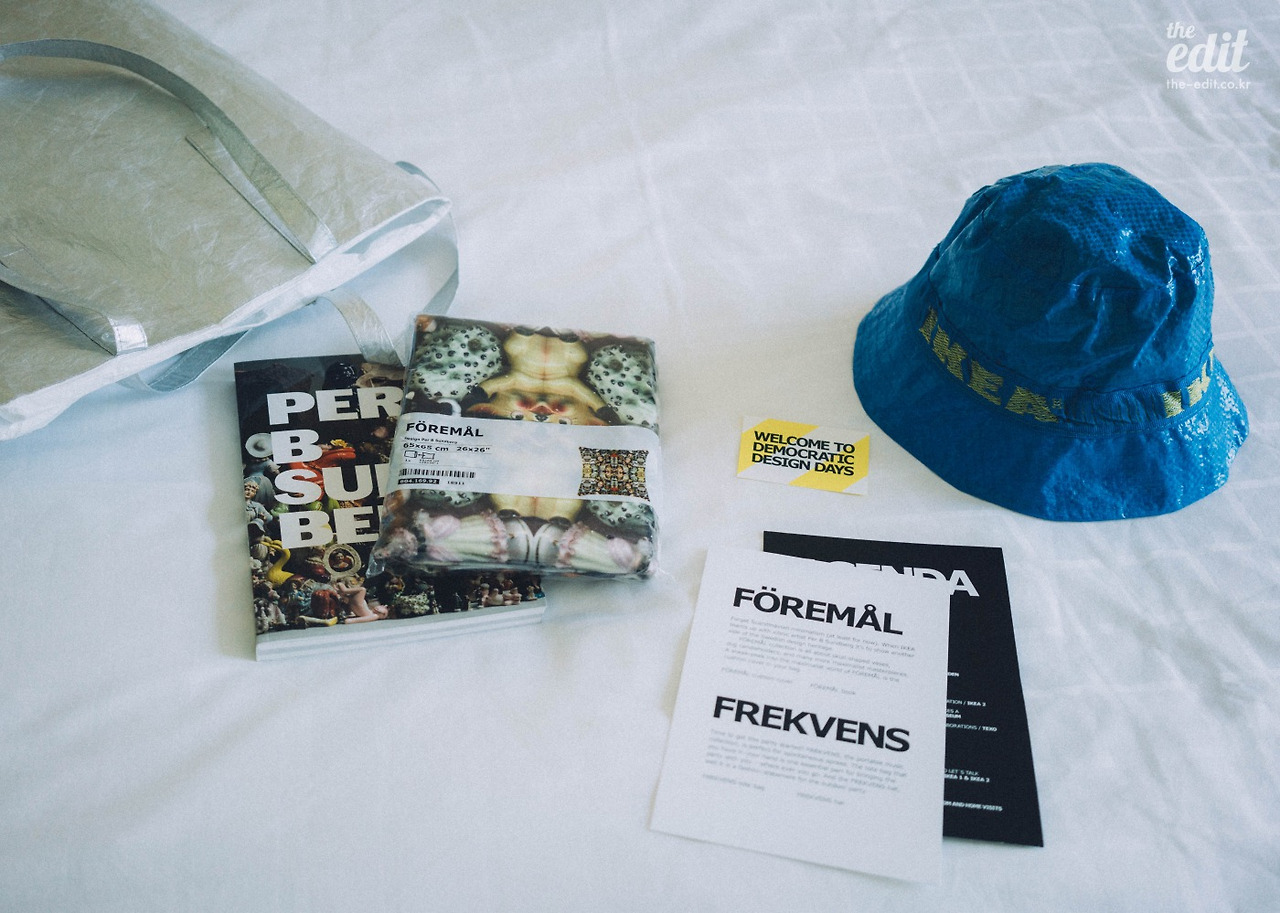 벽에 걸려있던 가방의 정체는 이케아가 전세계 기자들을 위해 준비한 구디 백입니다. 가방 안에는 이번 DDD의 시간표와 쿠션 커버 그리고 이케아 프락타백 소재로 만든 귀여운 벙거지 모자가 들어있더라고요. 아직 한 번도 써보진 못했지만 마음에 들어서 한국까지 가져왔어요.