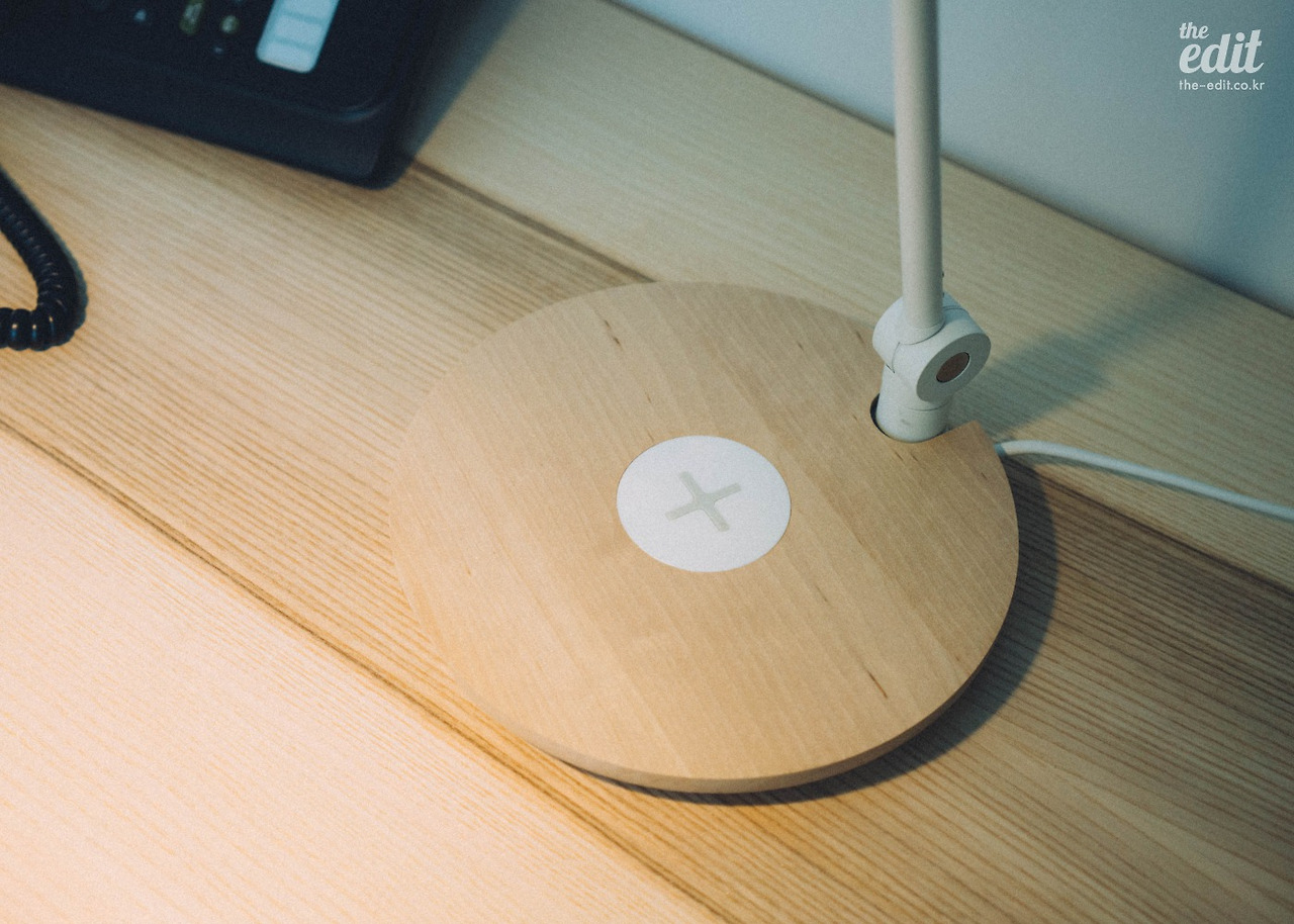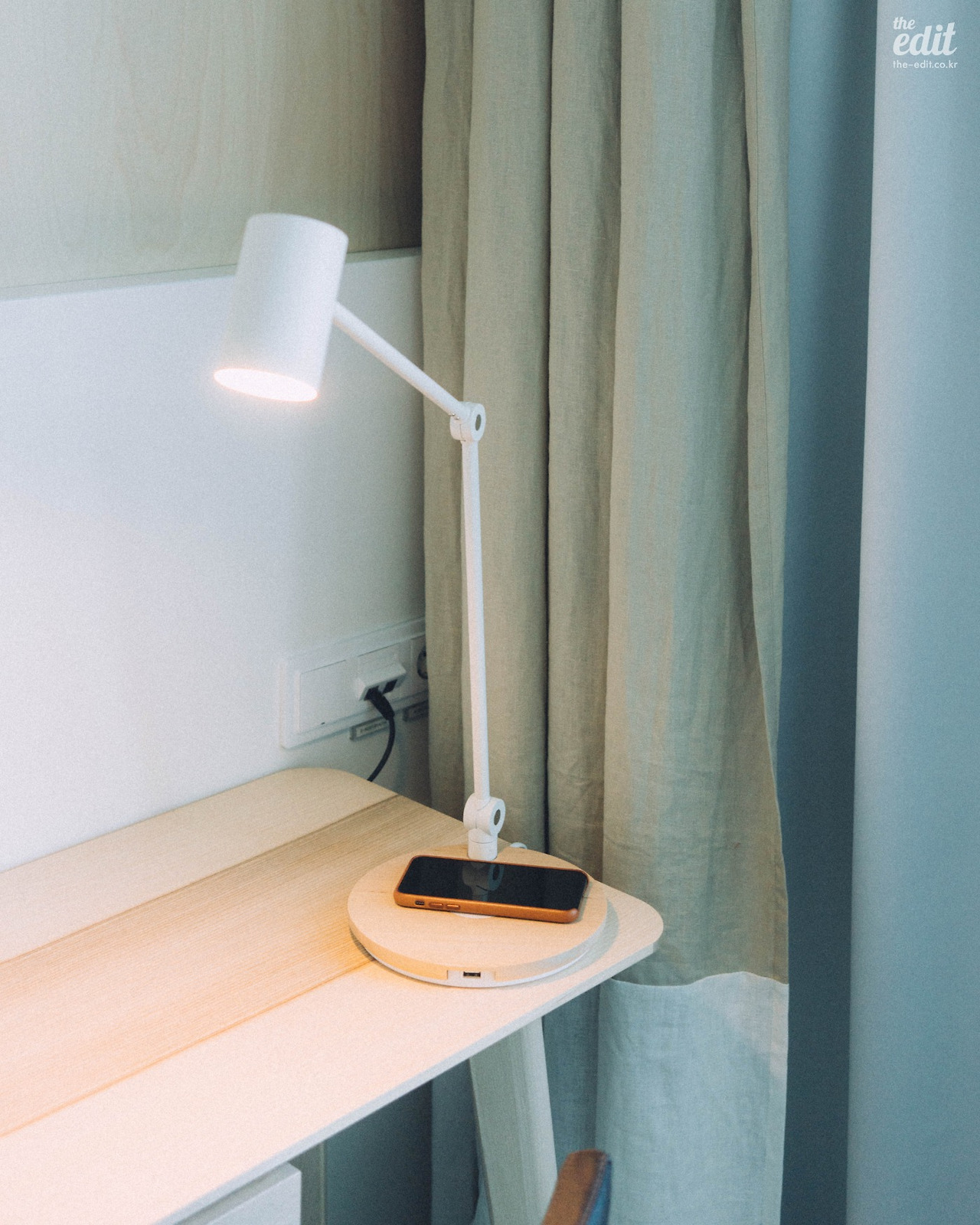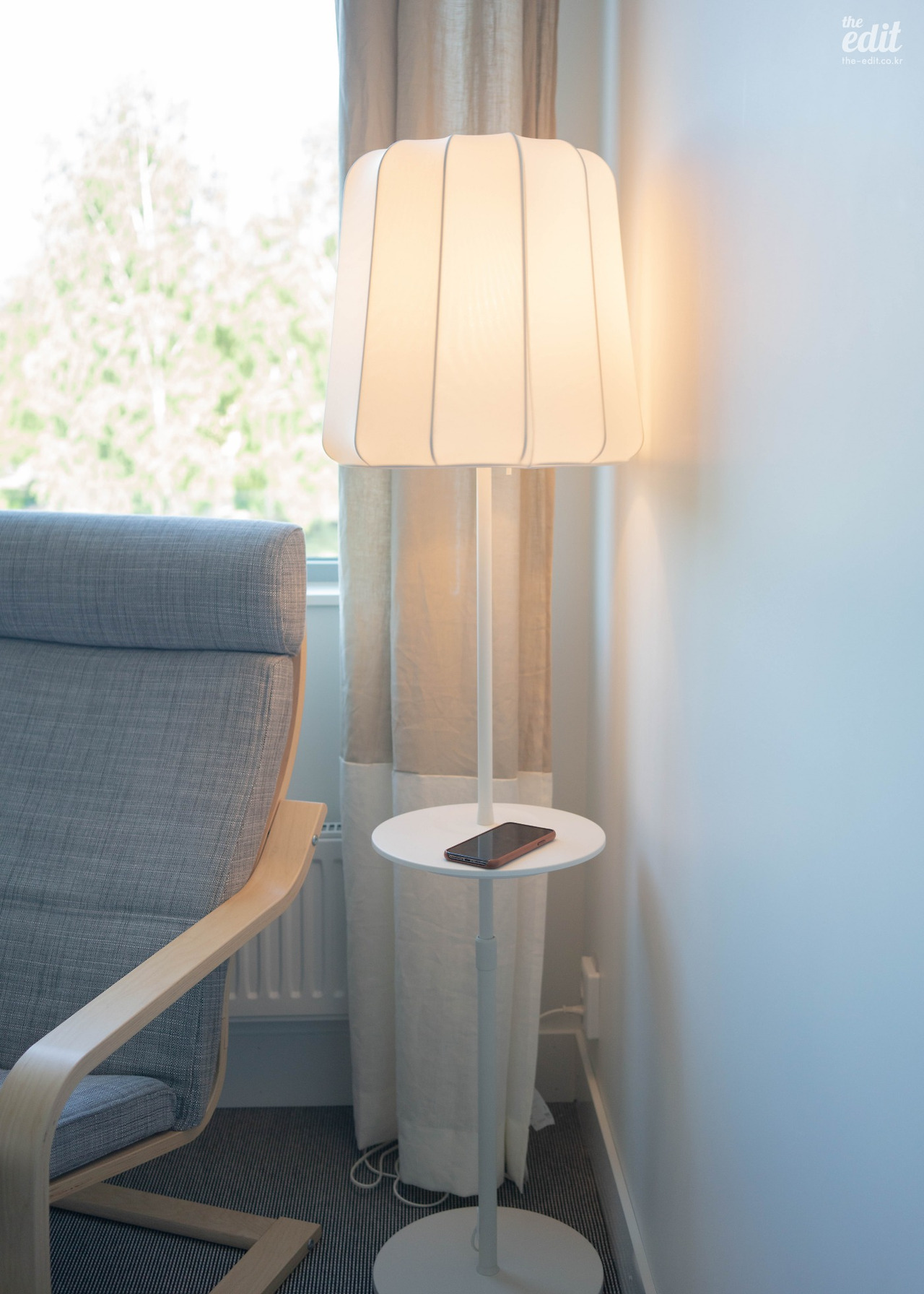 룸 곳곳엔 이케아의 무선 충전패드가 있었어요. 창문 앞 의자 옆에는 바르브 플로어 스탠드가, 업무를 보기 위한 책상에는 리가드 LED 스탠드 조명이 딱.