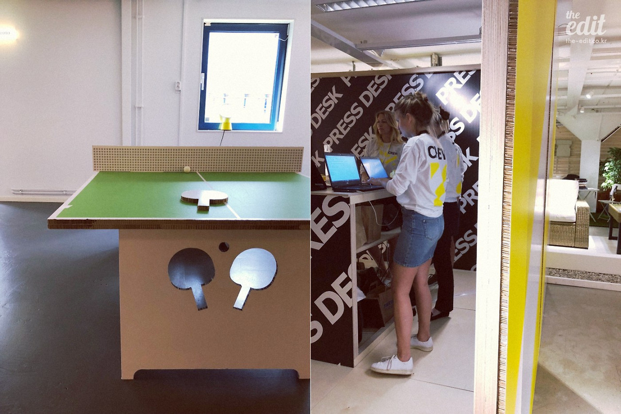 호텔로비부터 시작된 이케아의 카드보드지 사랑은 계속됩니다. 휴게실의 탁구대(심지어는 탁구채도)도 카드보드지로 만들고요. 전시장 내에서 기자들이 일할 수 있도록 마련한 미디어 부스도 이 카드보드지로 칸막이를 쳐서 만들었더라고요. 어차피 행사 기간 동안만 설치하고 버려지는데 재생이 불가능한 소재로 만들어서 낭비하긴 너무 아깝잖아요.