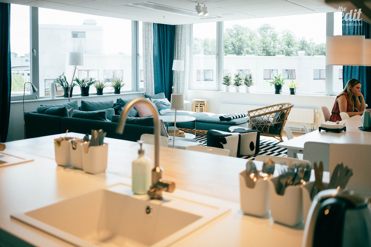 방을 나서고 긴 복도를 지나면, 넓은 공간의 라운지가 보입니다. 이 호텔에서 가장 제 마음에 들었던 공간이죠. 간단히 차를 즐기거나 음식을 데워먹을 수 있는 주방부터 책상, 소파까지 여기는 정말 이케아 쇼룸이라고 해도 손색이 없을 정도였어요. 호텔방에 있기 답답할 때에는 라운지에서 차를 마시기도 하고, 간단한 업무를 보기도 했습니다.