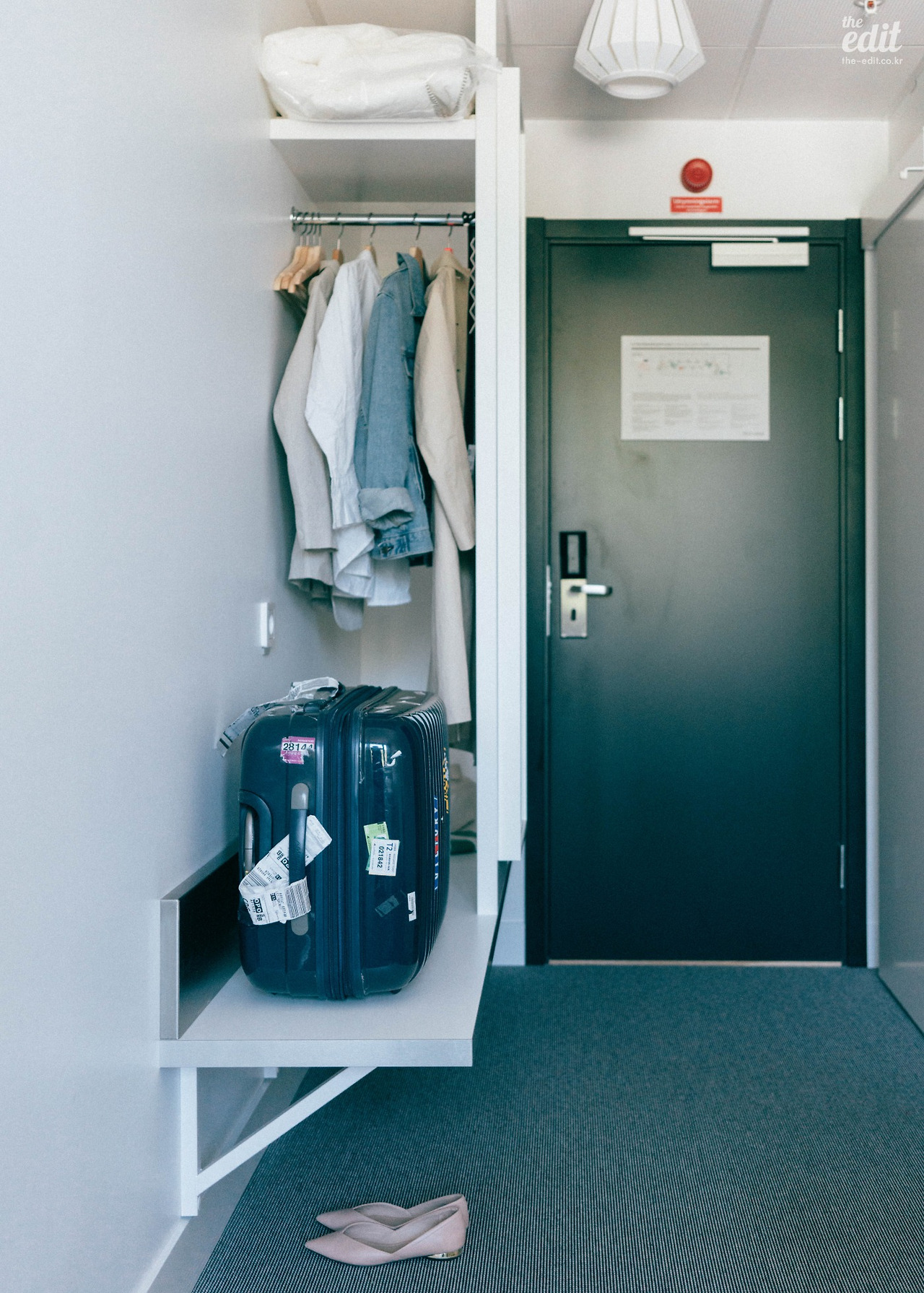 넓은 방은 아니지만 실용적이었습니다. 문을 열고 들어가자마자, 오른쪽에는 수납공간이 있습니다. 여느 5성급 호텔처럼 화려하게 짜여진 장은 아니에요. 불필요한 디테일을 모두 걷어내고 뼈대만 남긴 느낌? 최소한의 재료를 가지고 최고의 효율과 실용성을 취했다는 느낌이 강하게 들었어요. 캐리어를 넣어둘 수 있도록 한 공간은 개인적으로 참 좋았어요.