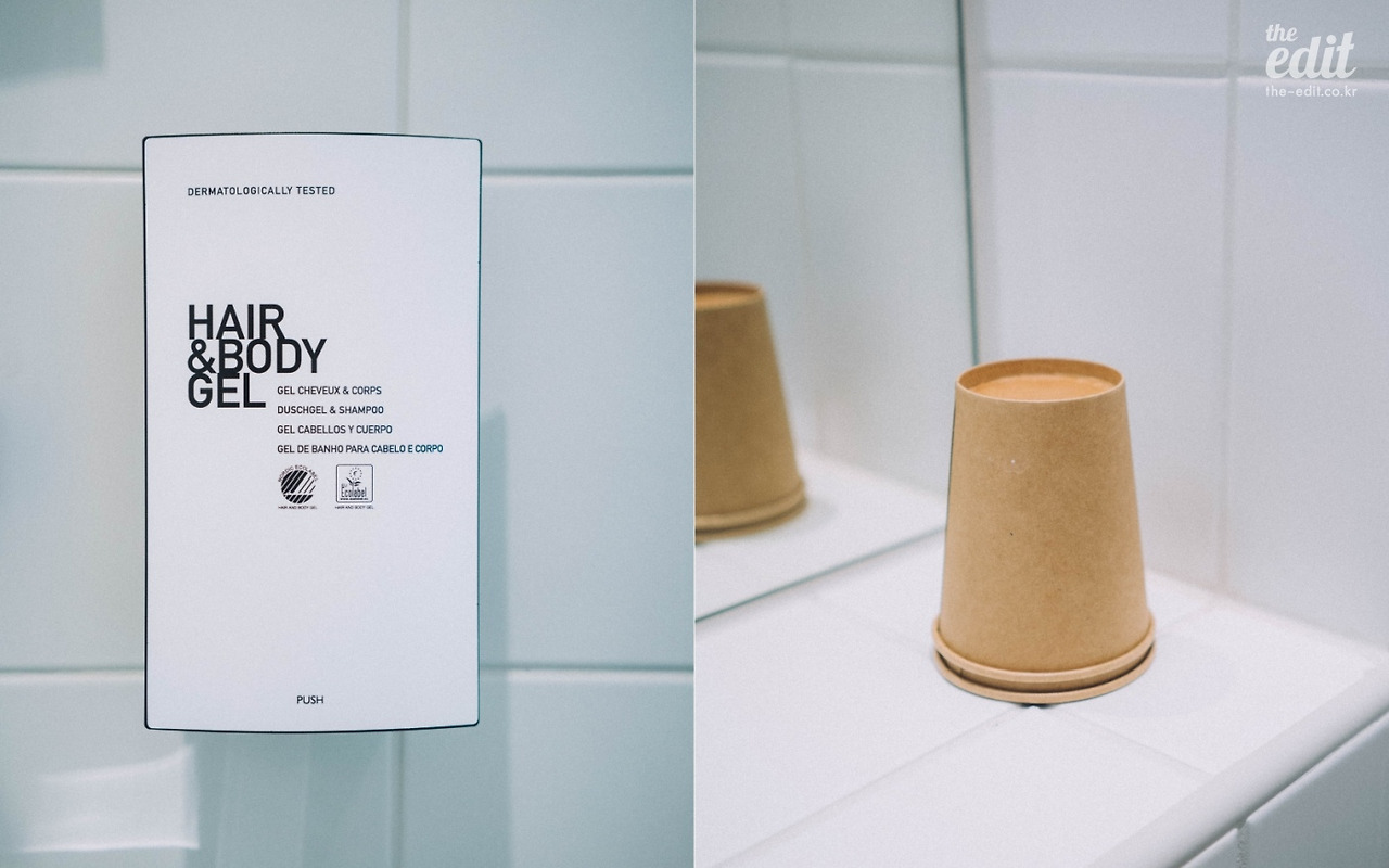 이런 느낌은 화장실에도 그대로 이어집니다. 샤워부스에는 머리끝부터 발끝까지 하나로 해결 가능한 올인원 세정제가 마련되어 있더라고요. 알뜰하죠? 저는 직접 챙겨간 샴푸를 썼어요. 헷. 아주 여러 차례 탈색한 제 머릿결은 저런걸로 감으면 살아남지 못해요. 심지어 양치용 컵도 재생지로 만든 제품이더라고요.