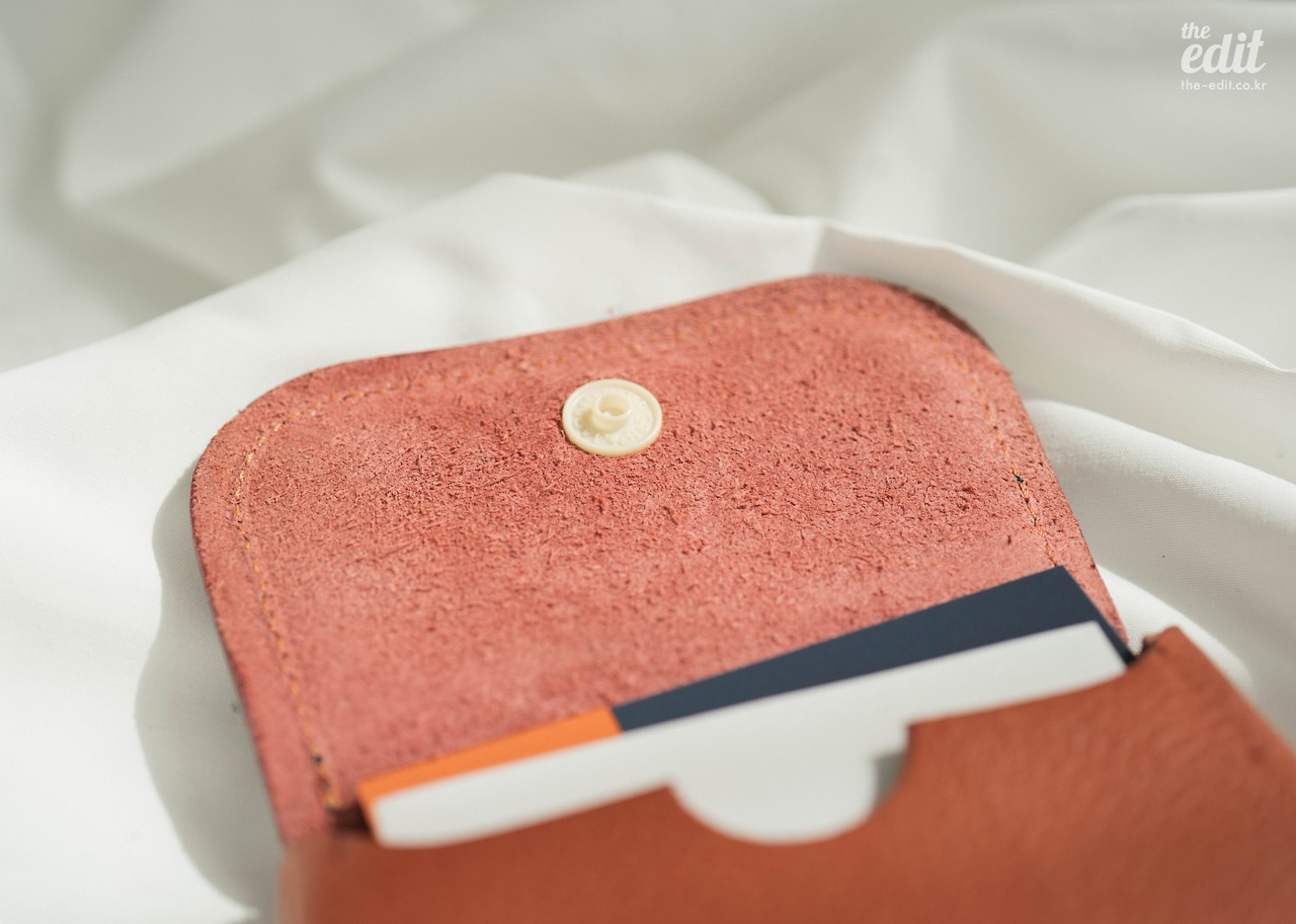 안쪽에 똑딱이가 있어 가방안에서 카드가 쏟아질 일이 없다. 작지만 수납력도 알차다. 안쪽엔 다른 카드와 명함도 여러 장 넣었다. 처음엔 좀 뻑뻑했는데 금세 자연스럽게 늘어나더라. 현금도 몇 만원 정도는 두 번 정도 접어 쏙 넣을 수 있다.