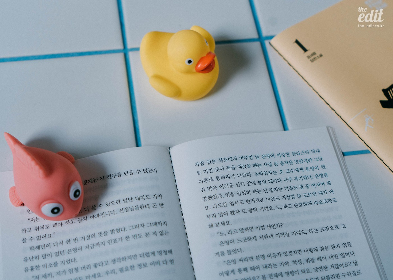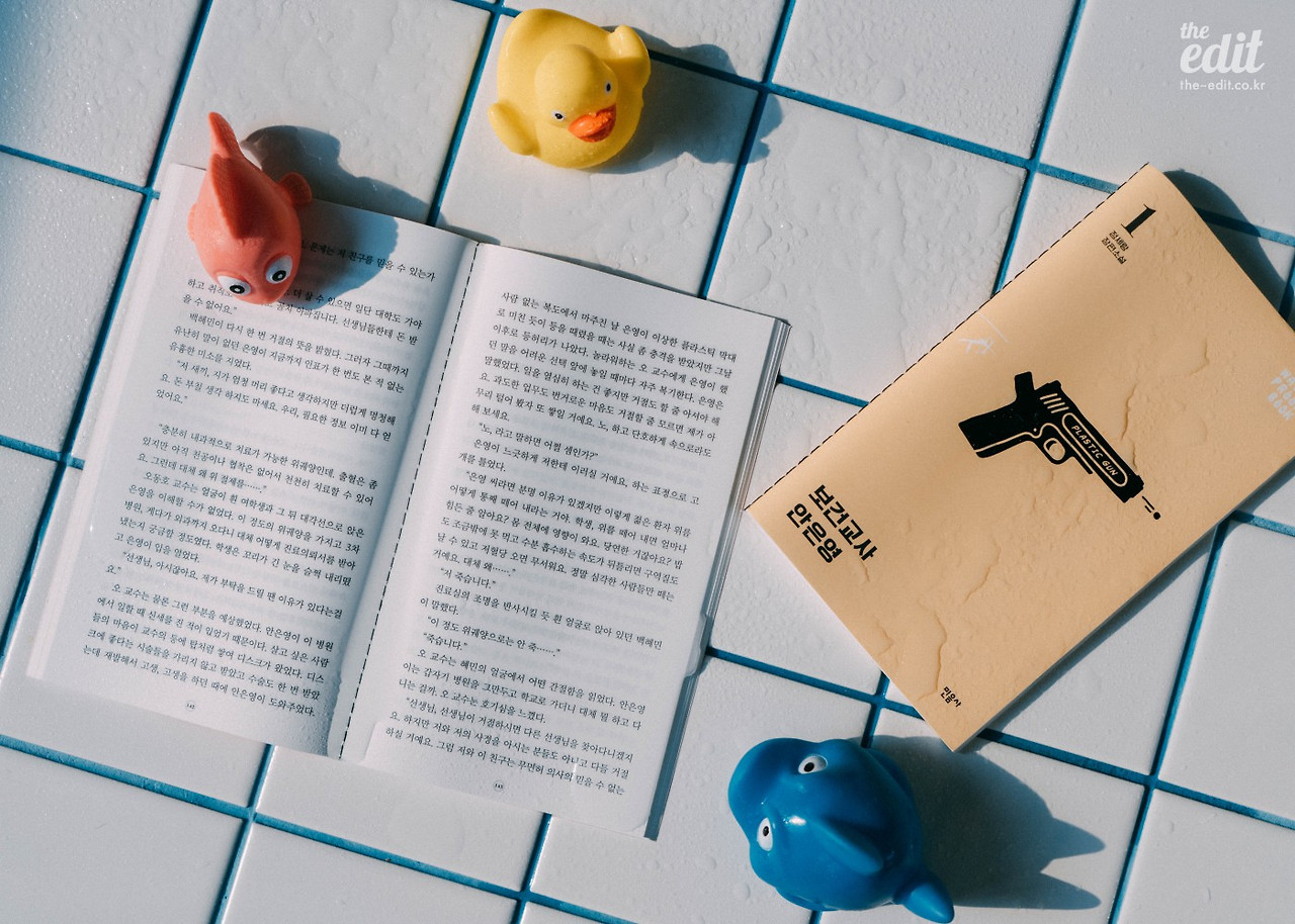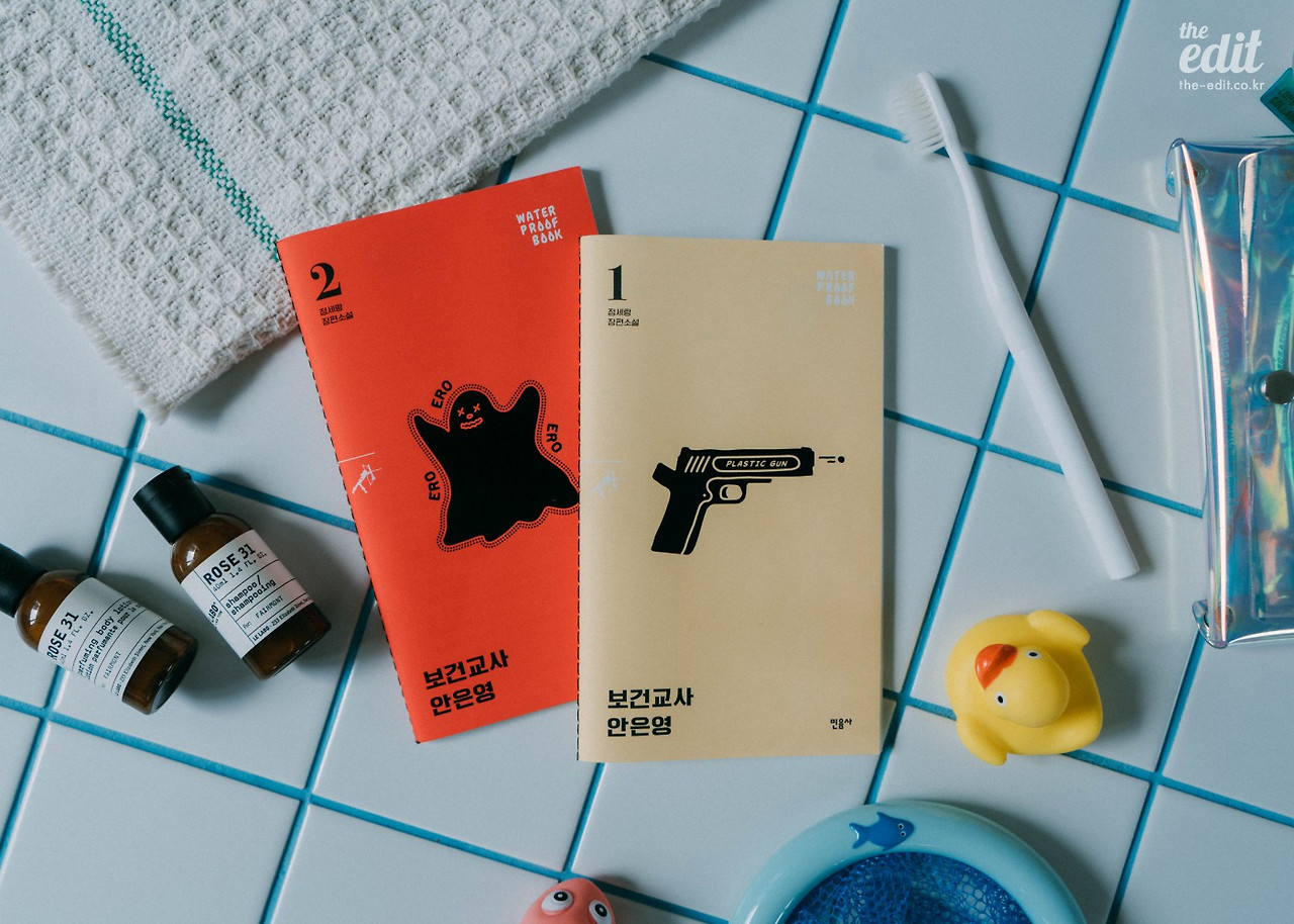 헌데 짠, 하고 젖지 않는 워터프루프책이 등장했다. 민음사가 익히 인기 있던 ‘오늘의 젊은 작가 시리즈’ 중 네 권을 워터프루프책으로 발간했다. <82년생 김지영>, <한국이 싫어서>, <보건교사 안은영>, <해가 지는 곳으로>가 방수 버전으로 나왔다. 물놀이 가기 딱 좋은 계절에 말이다! 투명한 PVC 파우치 안에 책이 들어있는 모습부터 물속에 풍덩 담그고 싶어진다.