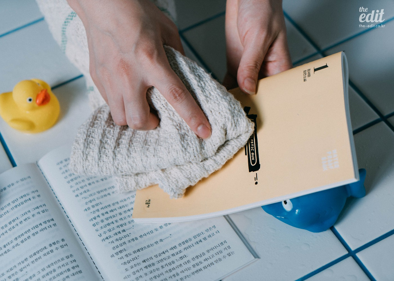 이 책의 용도를 상상해봤다. 물이 있는 곳이라면 어디든 어울릴 것이다. 수영장에 놀러 가 선베드에 누워 젖은 손으로 페이지를 넘겨도 좋고, 계곡물에 발을 담그고 읽어도 좋다. 여행지에서 책 읽는 경험을 소중히 여기는 사람들에겐 참 로망 같은 얘기다. 종이 젖을 걱정 없이 책을 읽을 수 있다니! 전자책이든 종이책이든 책은 물과 상극이라 배웠는데 말이다!