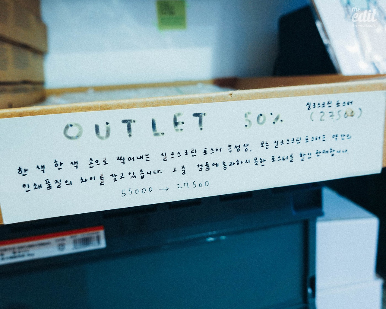 이들 포스터는 한 컬러씩 차례로 찍어내는 실크스크린 기법으로 만들어졌다. 개 중 품질이 떨어지는 작품은 할인된 가격에 판매중이다. 가격이 부담되는 사람은 최대 50%까지 할인하는 OUTLET 코너를 이용해도 좋겠다. 검품에 통과하지 못했다는 것은 지하철 역이 잘 안보이거나 노선도가 흐릿하다는 뜻이겠지. 하지만 역을 알아 볼 수 없어도 그 자체로 예술이며 작품이다. 지갑이 가벼웠던 나는 아무래도 이 코너의 포스터에 눈길이 갔다.