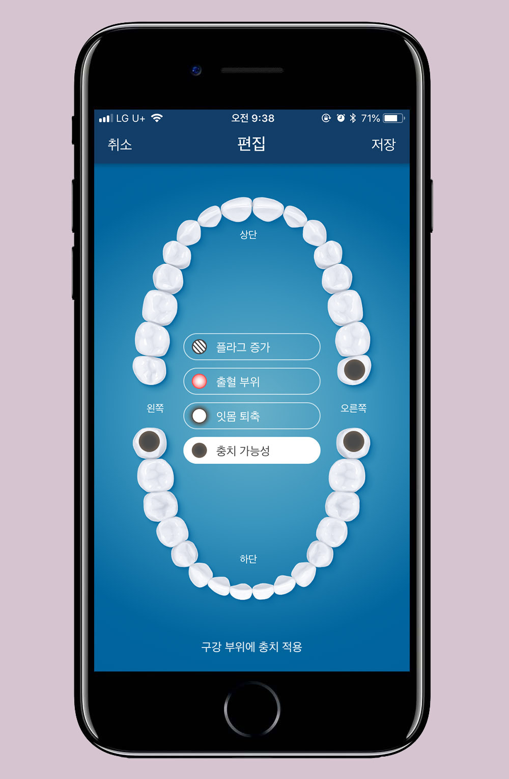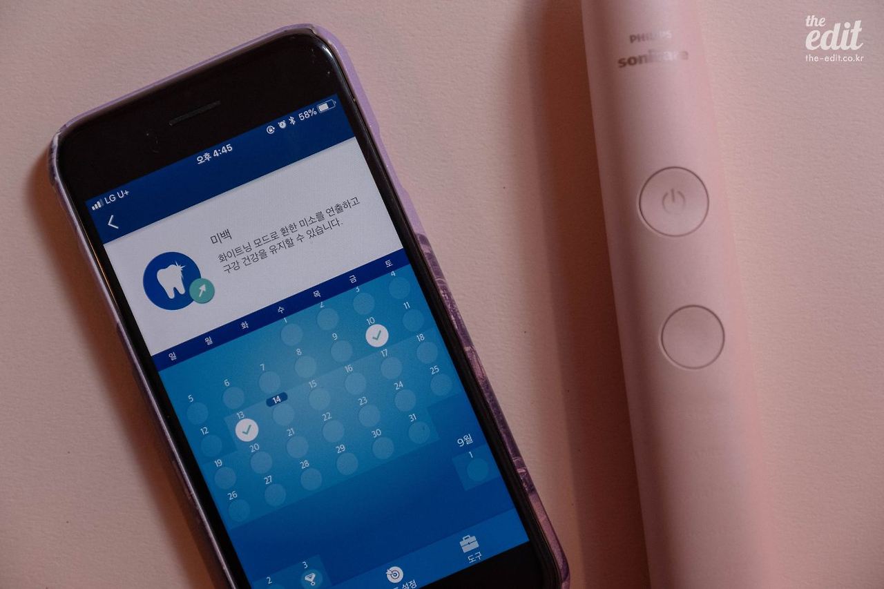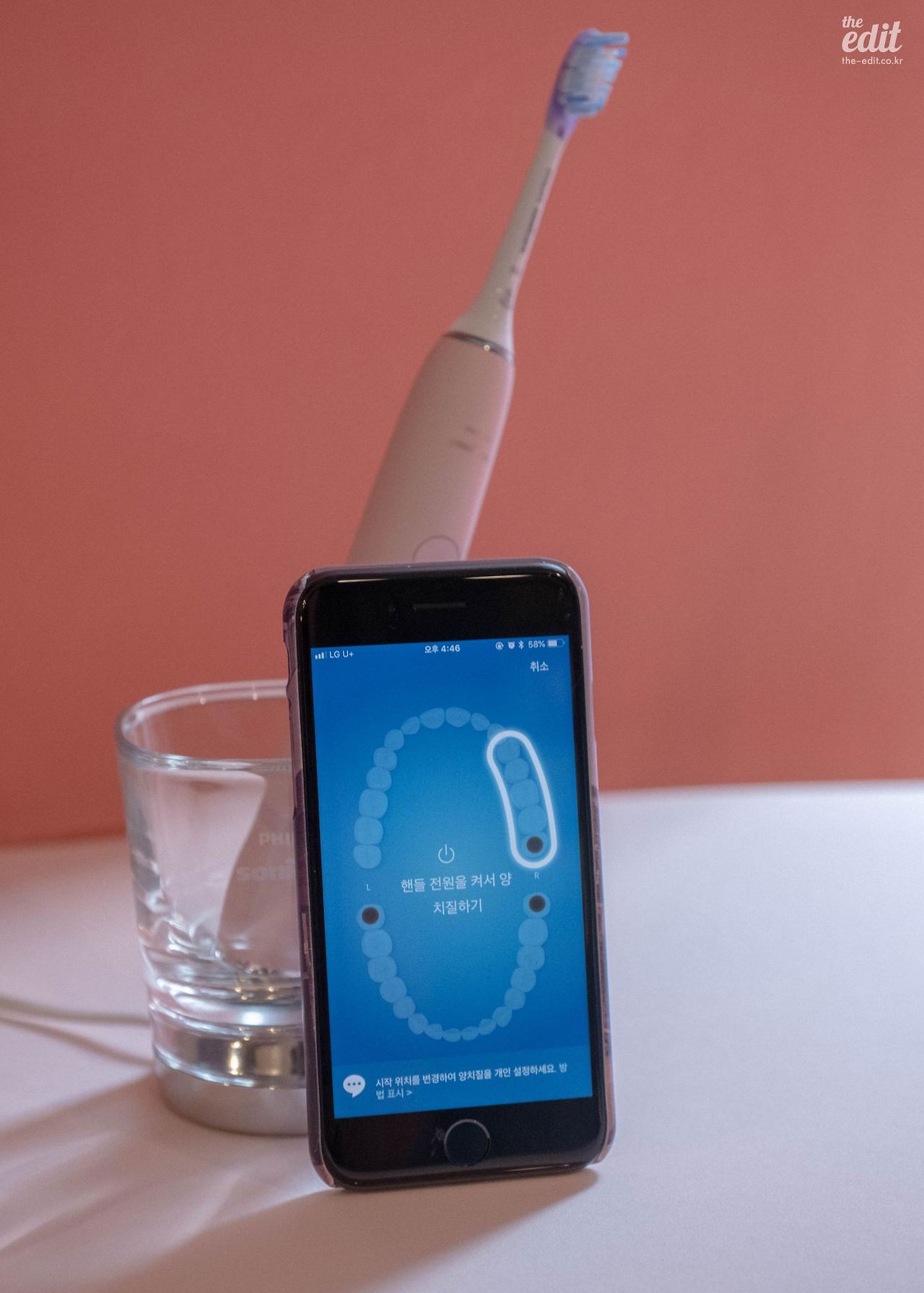 블루투스로 스마트폰과 연결할 수 있는 전용앱 ‘sonicare’는 정말이지 똑똑했다. 위치센서와 문지름센서, 압력센서가 구강 안을 3D맵으로 표현해 준다. 구강을 12개로 분류하고 세정모드에 따라 다른 양치방법을 제안하기도 한다. 집중관리 부위를 선택해 관리할 수 있는 기능도 있다. 플라그 증가, 출혈 부위, 잇몸 퇴축, 충치 가능성 등을 구강 맵 위에 표시해 쉽게 확인할 수 있다. 사랑니를 뽑지 않아 고통받는 에디터 기은은 사랑니를 세 개를 충치가능성 치아로 입력해 두었다. 양치 후 잘 안 닦인 부분은 화면에서 누렇게 표시해주어 죄책감이 생기게 하는데, 이 효과가 아주 강력하다. 누레도 너무 누레서 다시 닦게 만든다.