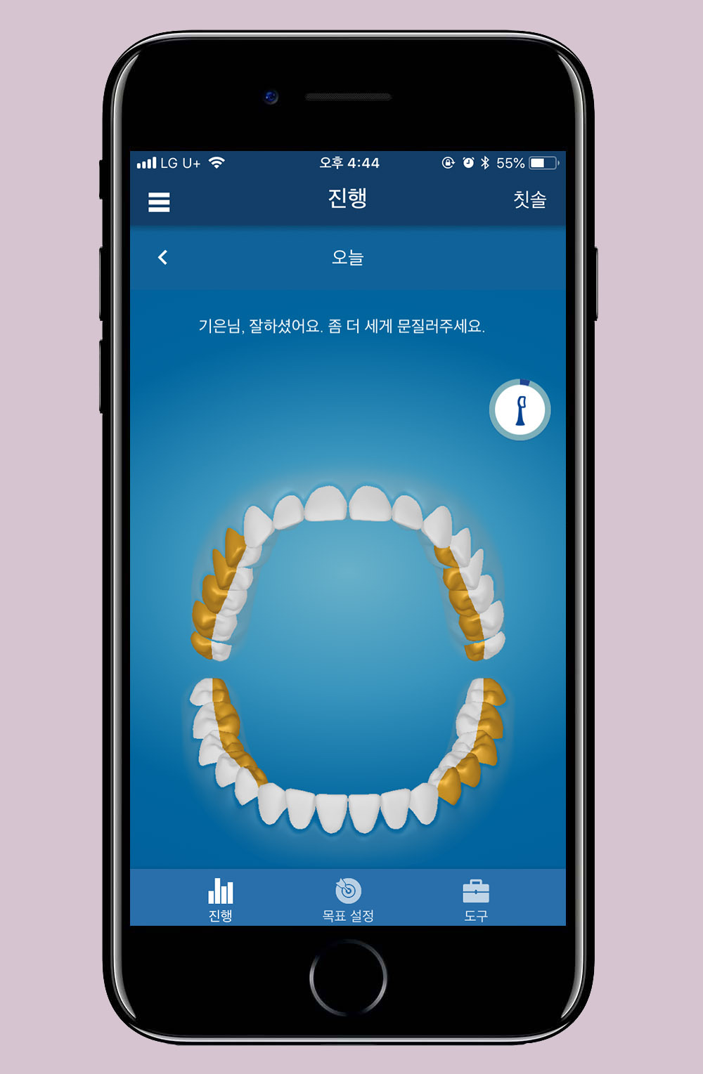 치아 교정치료를 받는 나는 교정기 사이 이물질이 많이 끼기 때문에 deep clean 모드를 애용했다. 치실을 사용해도 찝찝했는데 다이아몬드 클린 스마트를 이용하자 평소보다 깨끗한 결과가 나왔다. 진동 세기는 1단계부터 3단계까지 조절 가능하다. 사람에 따라 다르겠지만 1단계에 놓고 쓰는 게 부담없다. 앱이 너무 좋은 나머지 금단현상도 겪었다. 앱을 켜지 않고 양치를 시작했더니 잘하고 있는지 혼란스럽더라. 급기야 불안해져 스마트폰을 다시 손에 쥐었다.