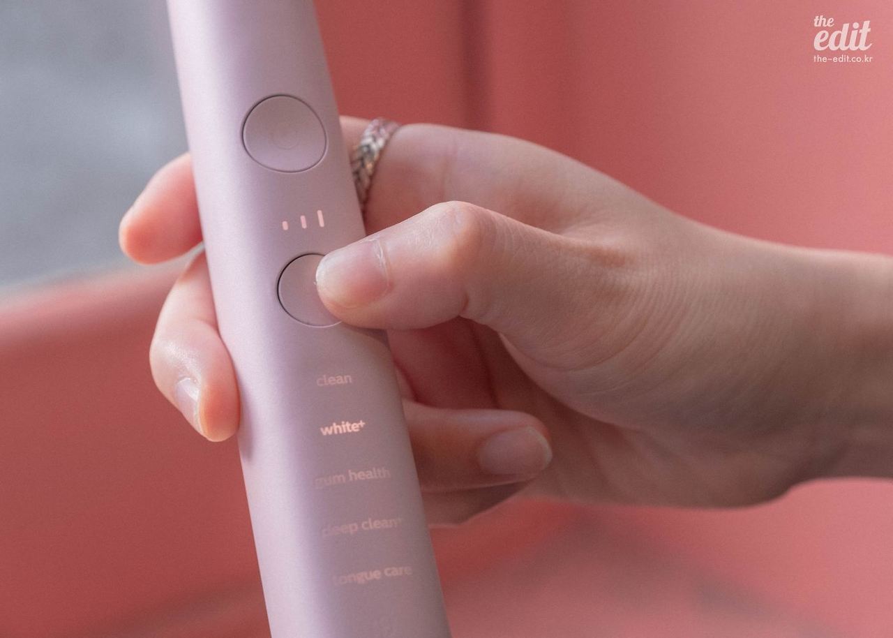 다섯 가지 세정모드를 통한 특징도 분명하다. 일반세정모드, 치아 미백을 위한 화이트+모드, 딥클린+모드, 잇몸이 약한 사람을 위한 잇몸케어, 혀클린 모드가 있어 섬세하게 케어해준다. 가장 신기한 포인트는 이거다. 칫솔모의 종류에 따라 최적의 모드와 강도가 자동 설정된다는 사실.