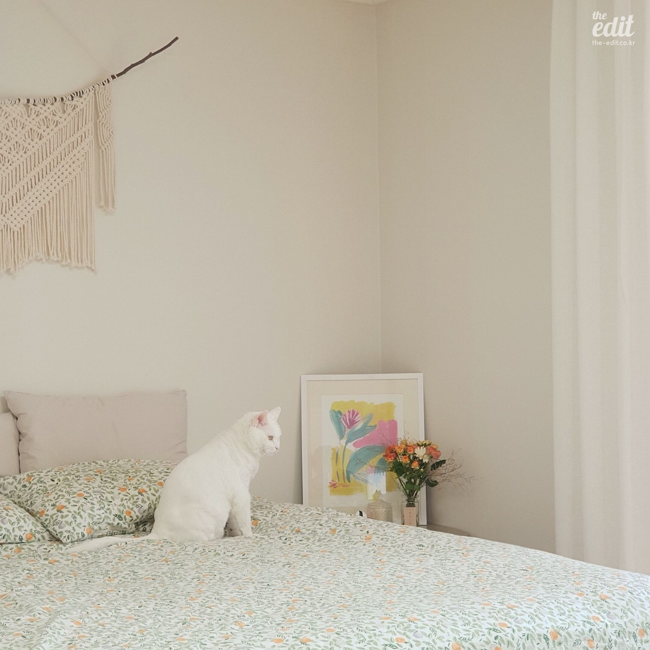 선물 받은 그림이 마음에 들어 침실에 <In spring> 아트 포스터를 추가로 구입했다. 침실 가구는 킹 사이즈 침대와 사이드 테이블이 전부라 다소 밋밋한 공간을 그림이 채워준다. 가끔 꽃을 올려두거나 고양이가 모델처럼 포즈만 취해주면 진짜 그림같은 인증샷을 찍을 수 있다. A3 사이즈 기준 3만 5,000원선.
