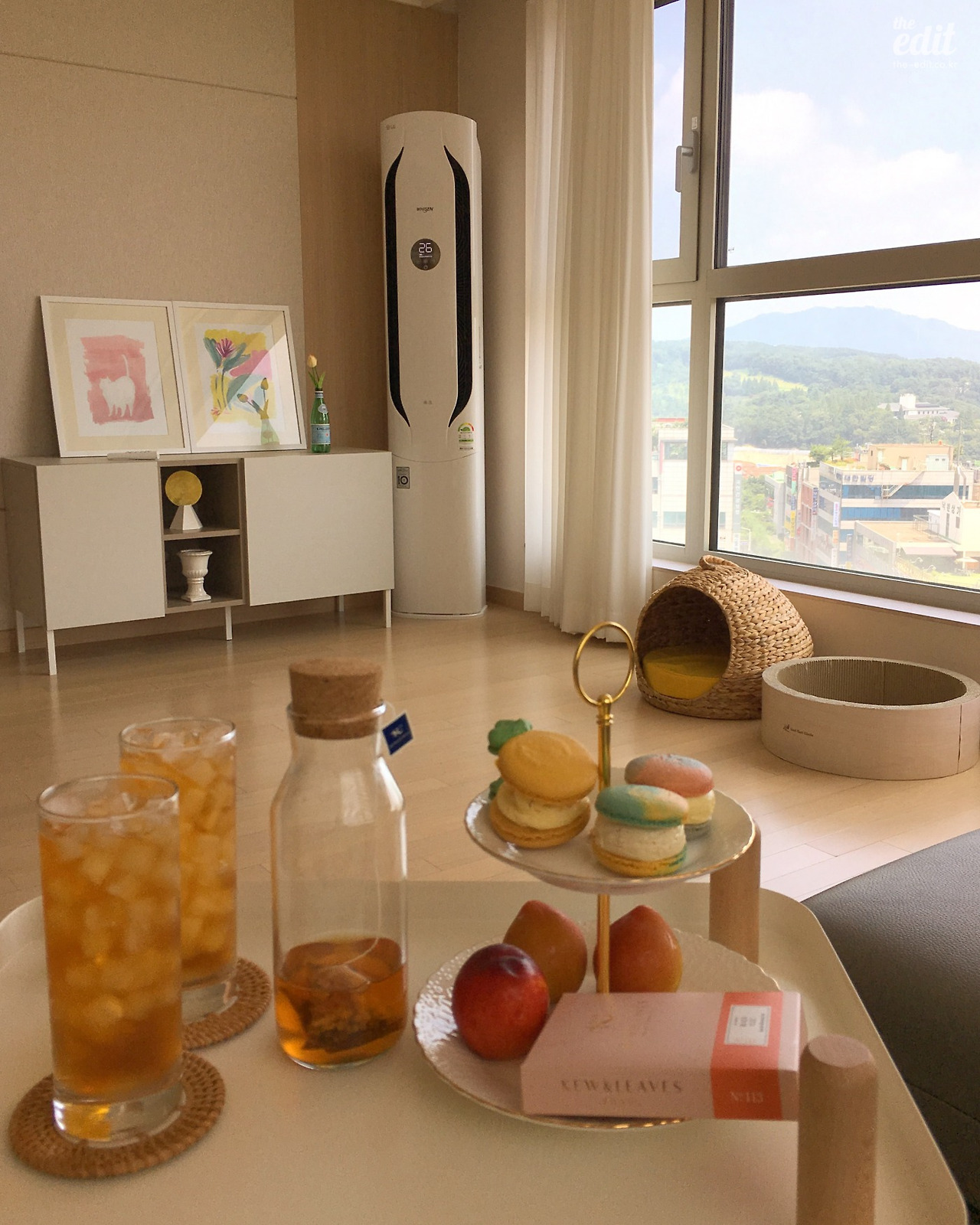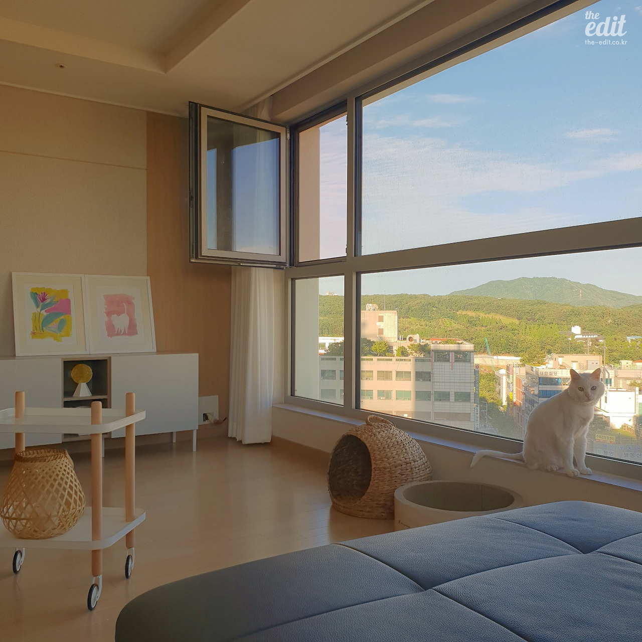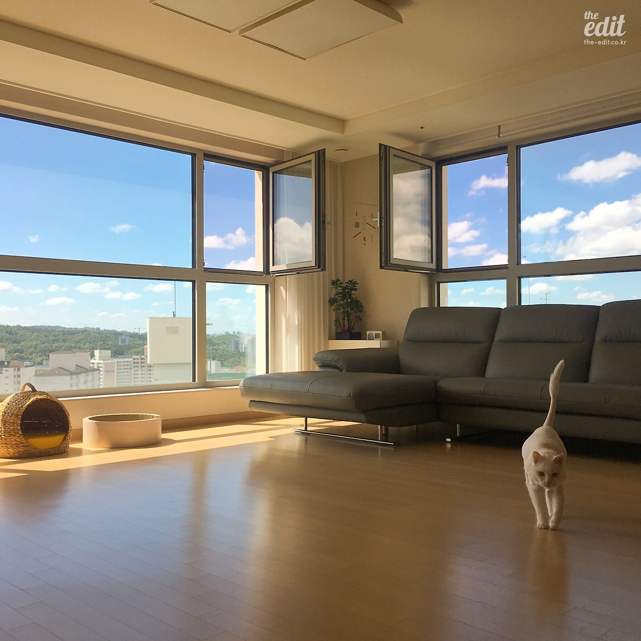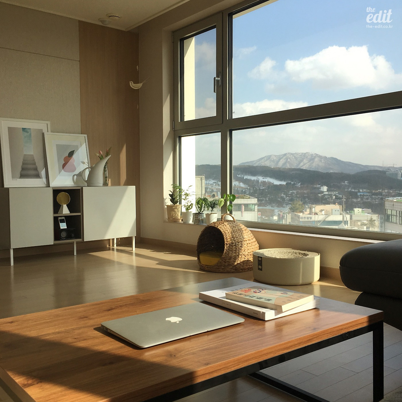 이제 현실적인 집 소개로 넘어가보자. 우리집은 작년에 농담 좀 보태서 오조 오억 개의 남의 집을 돌아다녀 찾아낸 창문 많은 집이다. 양창형 거실로 정면과 측면이 통창으로 이뤄져 있어 하루 종일 볕이 들어오고 뷰 빼면 시체인 집이다. 첫 신혼 집에서 겪었던 날카로운 곰팡이의 추억을 말끔히 씻어내기 유감 없는 집이다. 비록 은행과 사이 좋게 공동명의지만.
